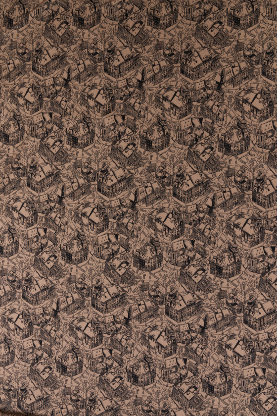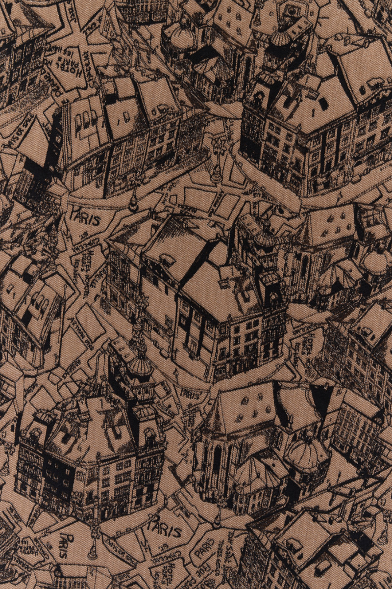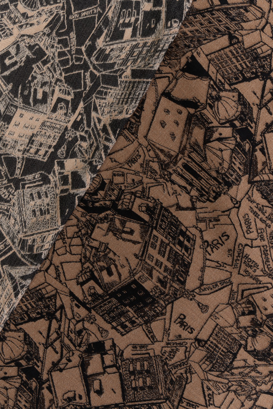 Tissu de costume en jacquard italien représentant un plan de la ville sur un fond de chameau. Un motif dense et répétitif réalisé en noir représente différents types de bâtiments et de rues avec leurs noms. Le tissu est doux, élastique, opaque et se drape bien. Il est parfait pour coudre un costume, une robe, une jupe et un pantalon.