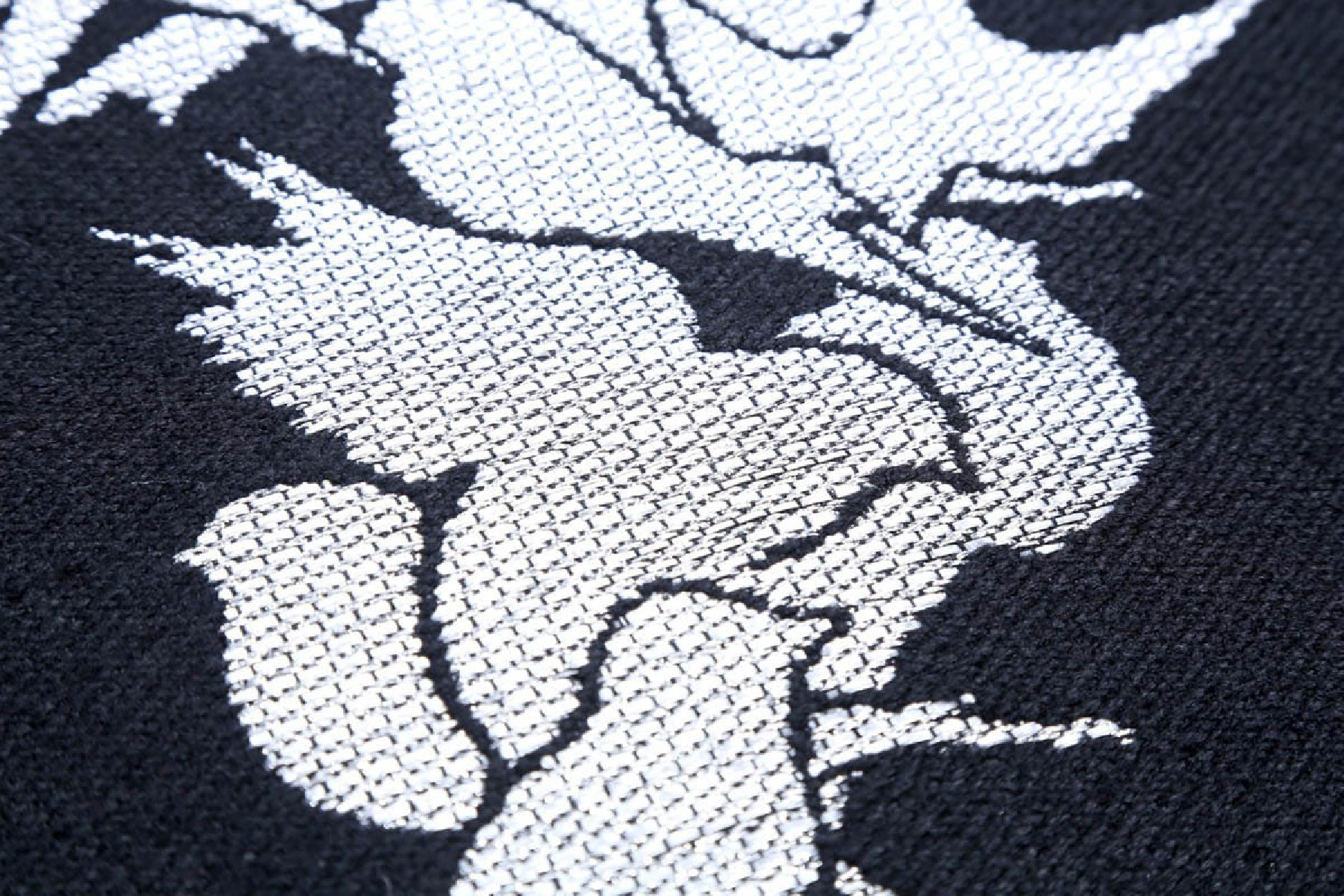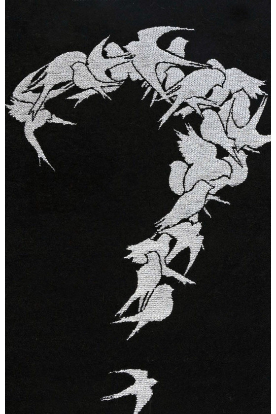 Tissu jacquard italien dans un coupon de dimensions de 65cm x 65cm. Un motif très intéressant d’hirondelles argentées qui forment un point d’interrogation. Le tout est brodé sur un fond noir et donne un effet très original. Le tissu peut être utilisé comme détail original en combinaison avec un autre matériau, par exemple comme « devant » d’un sweat-shirt ou « dos » dans une veste. Il sera également parfait comme décoration, par exemple un oreiller.