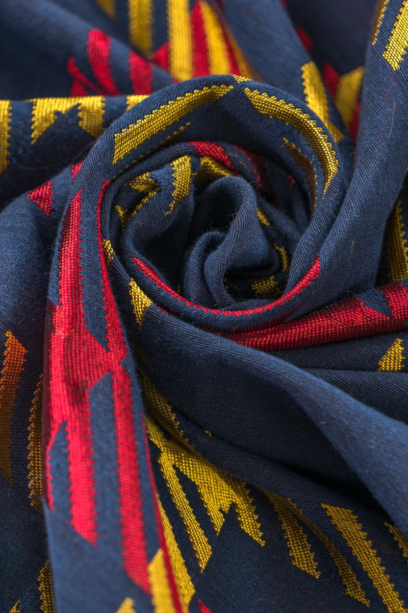 Tissu de costume en jacquard italien avec un grand motif à carreaux d’environ 20 cm. Il se compose de bandes d’environ 3 à 4 cm de large, disposées en bandes diagonales plus petites. Le matériau est d’une belle couleur bleu marine avec un motif jaune et rouge. En raison du fait que le motif est très grand, le tissu est le mieux adapté pour coudre des vêtements composés d’éléments plus grands tels qu’un manteau, une veste ou une « grande » robe ou jupe.