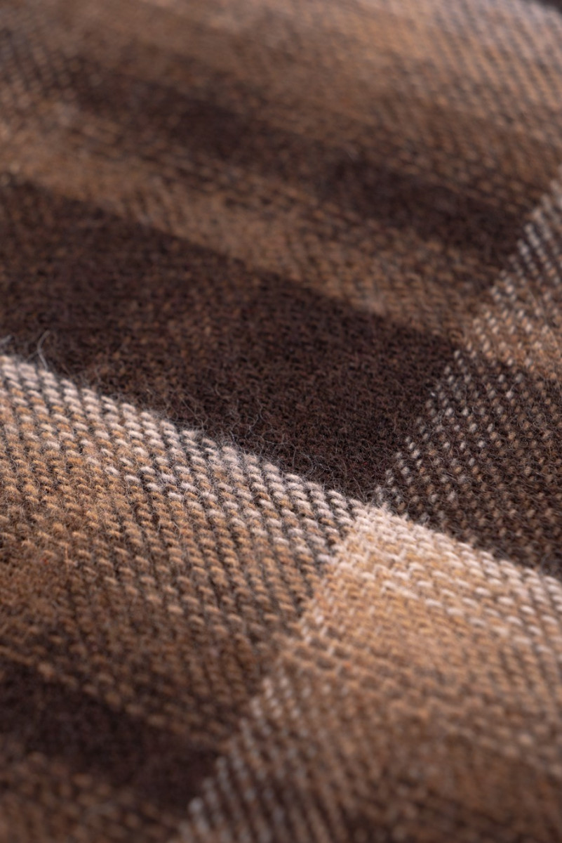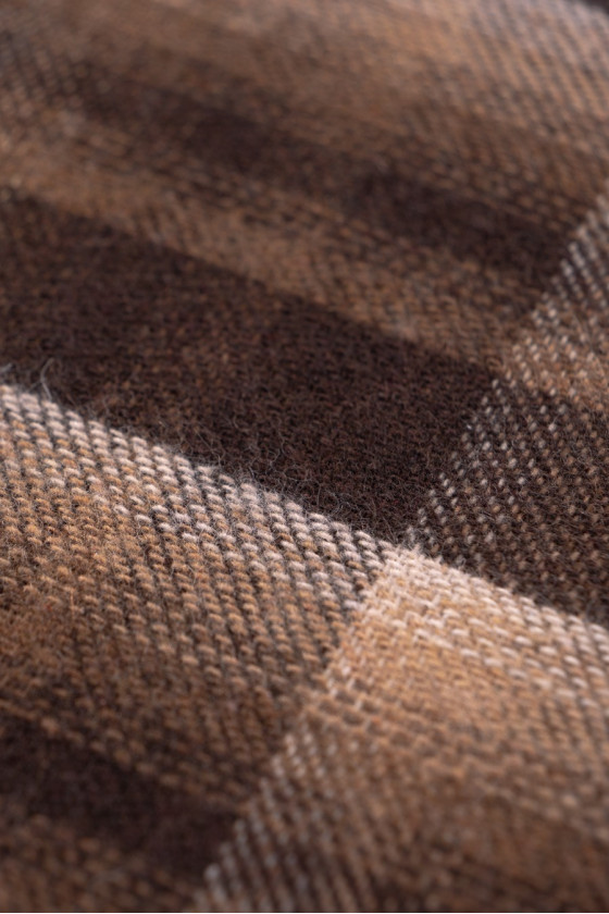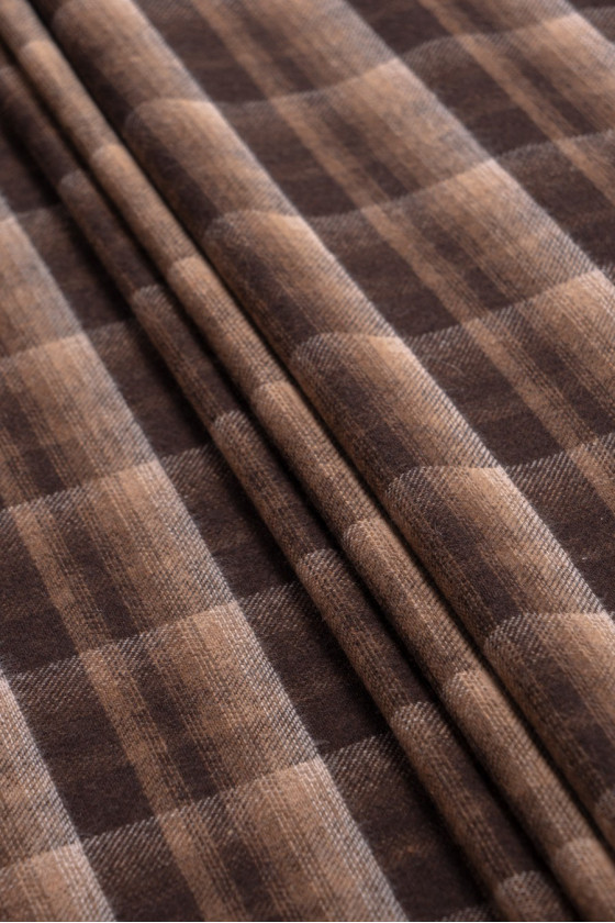 Un tissu chaud à carreaux marron et beige, parfait pour les cardigans ou les costumes automne-hiver. Tissu doux, avec des poils délicats, très agréable au toucher