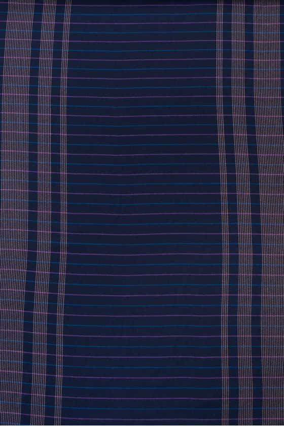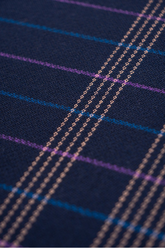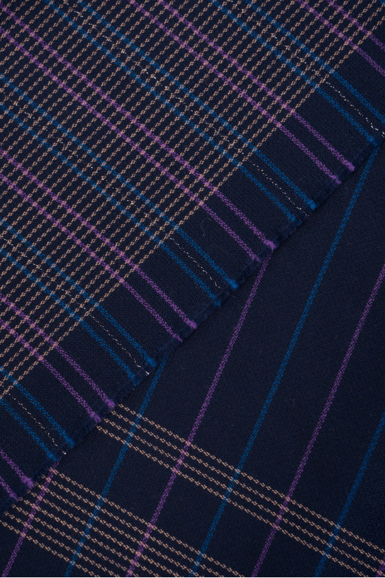 Une proposition très originale pour un manteau ou une veste plus fin à un prix avantageux ! Tissu de laine, tissé serré dans un délicat tissage jacquard, double face. Sur fond bleu marine, des rayures verticales de bleu et de bruyère, tous les 5 cm une fine bande de fil de lurex (sur un côté du tissu), sur une fine bande de beige en rapport recto-verso à 45 cm de la lisière. Le tissage doit être cousu sur la circonférence, aucune doublure n’est nécessaire.
