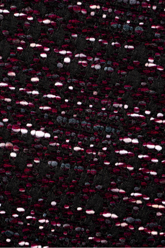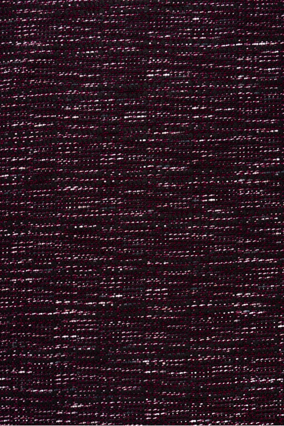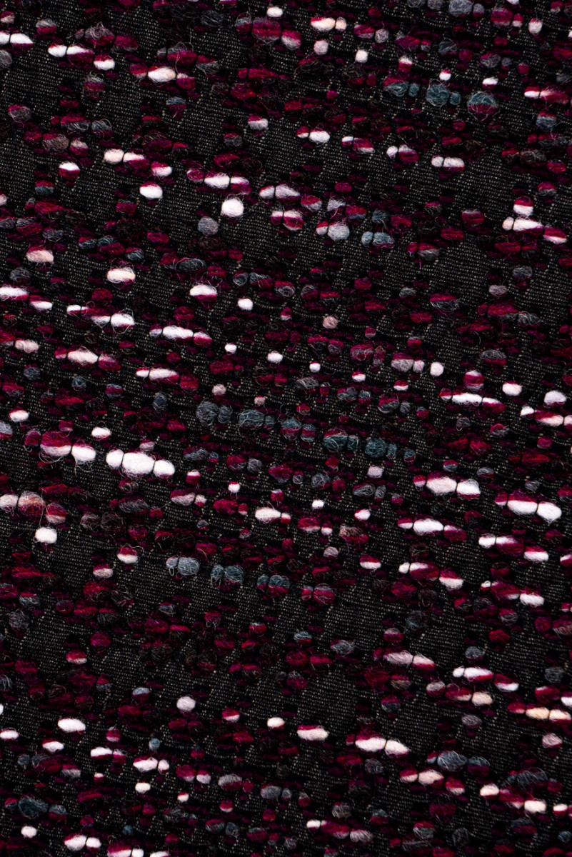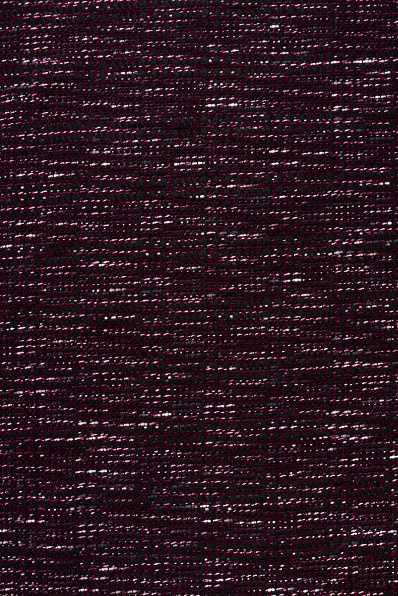 Tissu de costume italien noir avec des fils tissés en écru, fuchsia et violet. Tissé à partir de laine naturelle avec un mélange de viscose. Tissu légèrement rigide - parfait pour coudre une robe, un costume ou une jupe.