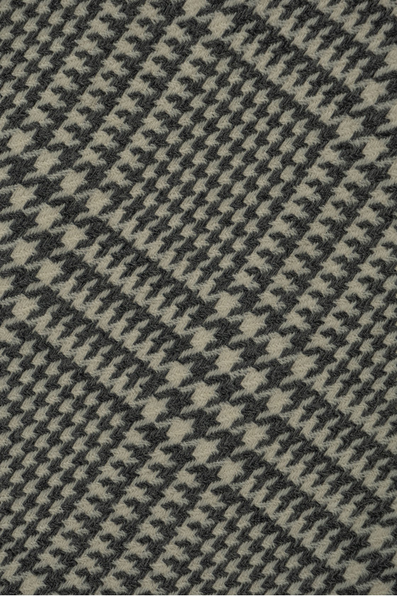 Laine de costume italien avec un tissage sergé à motif à carreaux et une patte de poulet en écru avec gris. Tissu plus épais et charnu du genre automne-hiver.