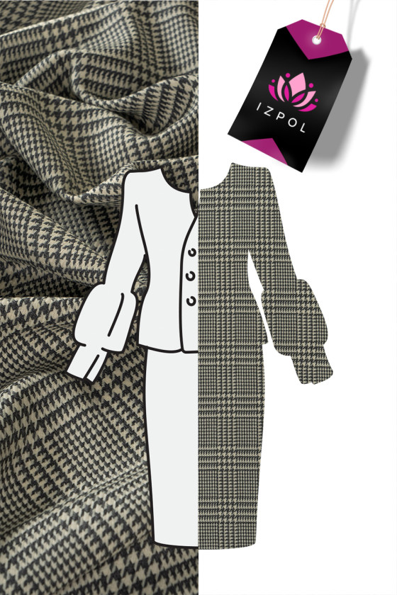 Laine de costume italien avec un tissage sergé à motif à carreaux et une patte de poulet en écru avec gris. Tissu plus épais et charnu du genre automne-hiver. Parfait pour coudre un costume, une jupe, une robe ou une veste.