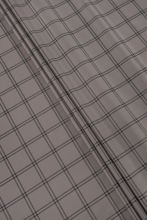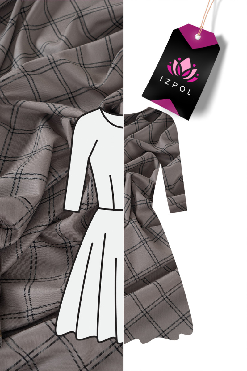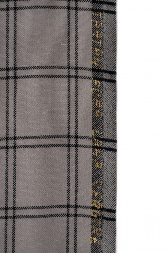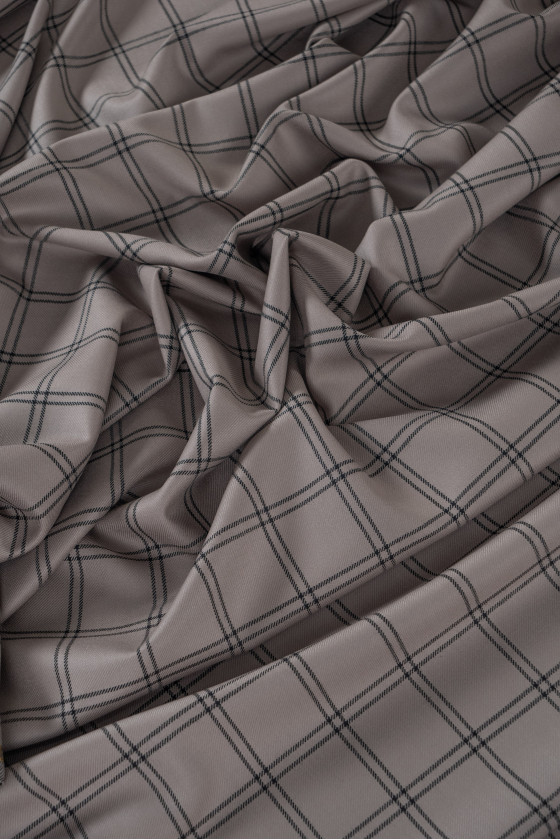 Laine fantaisie italienne avec un tissage sergé gris-beige avec un motif à carreaux noirs (8 cm). Tissu non élastique d’une épaisseur classique. Parfait pour coudre une robe, un costume, un costume, un pantalon ou une jupe. Composition : 100% laine vierge