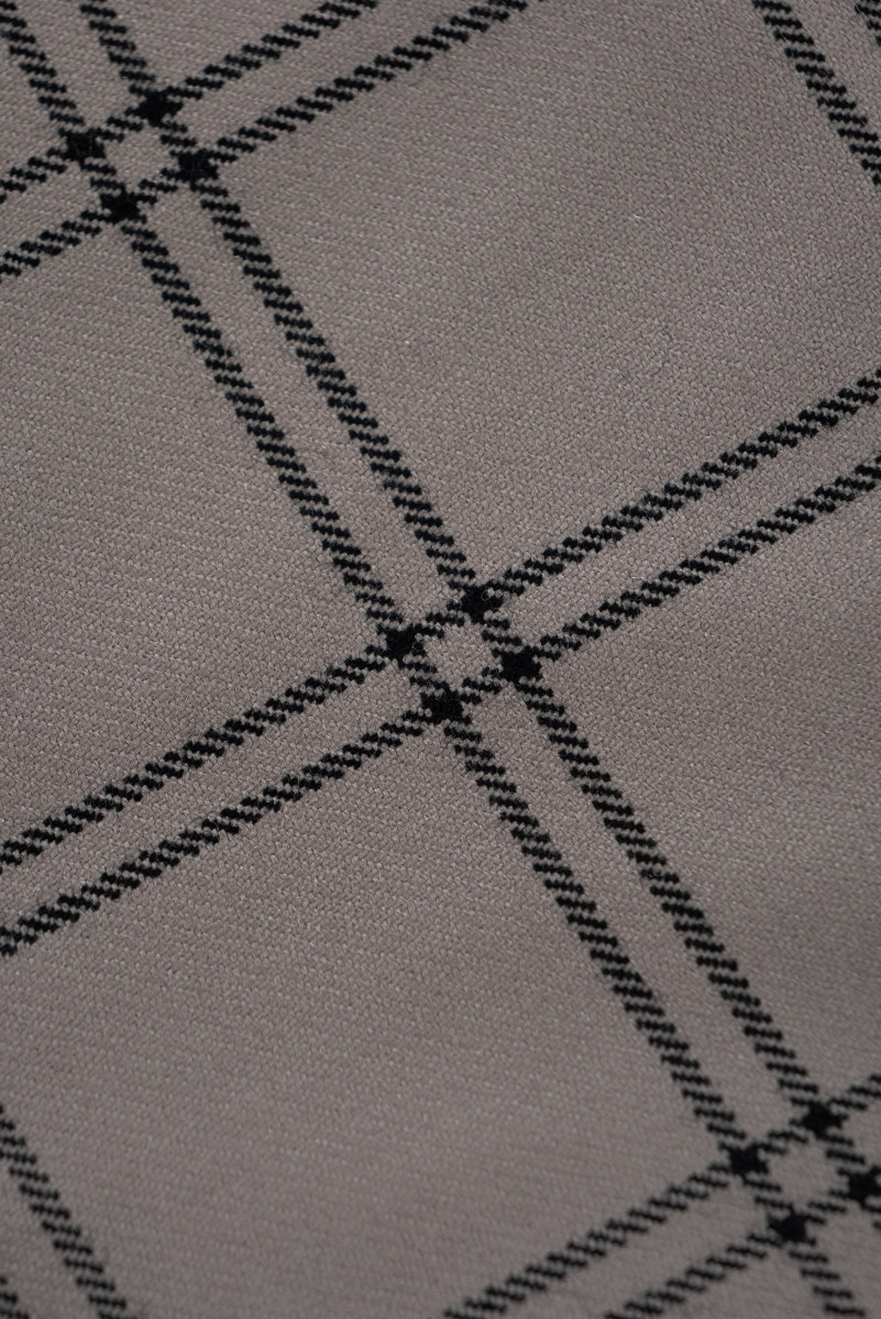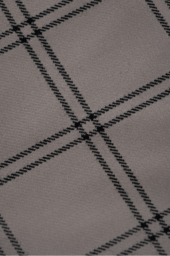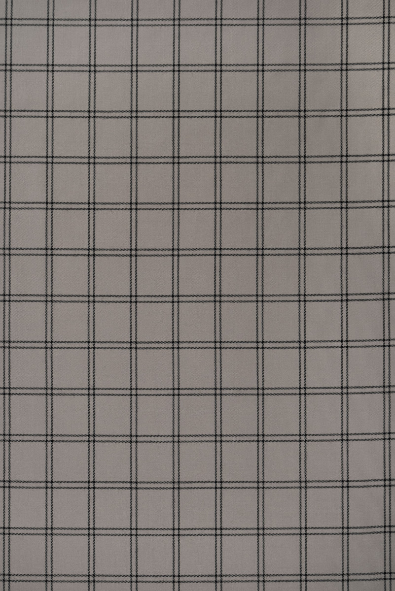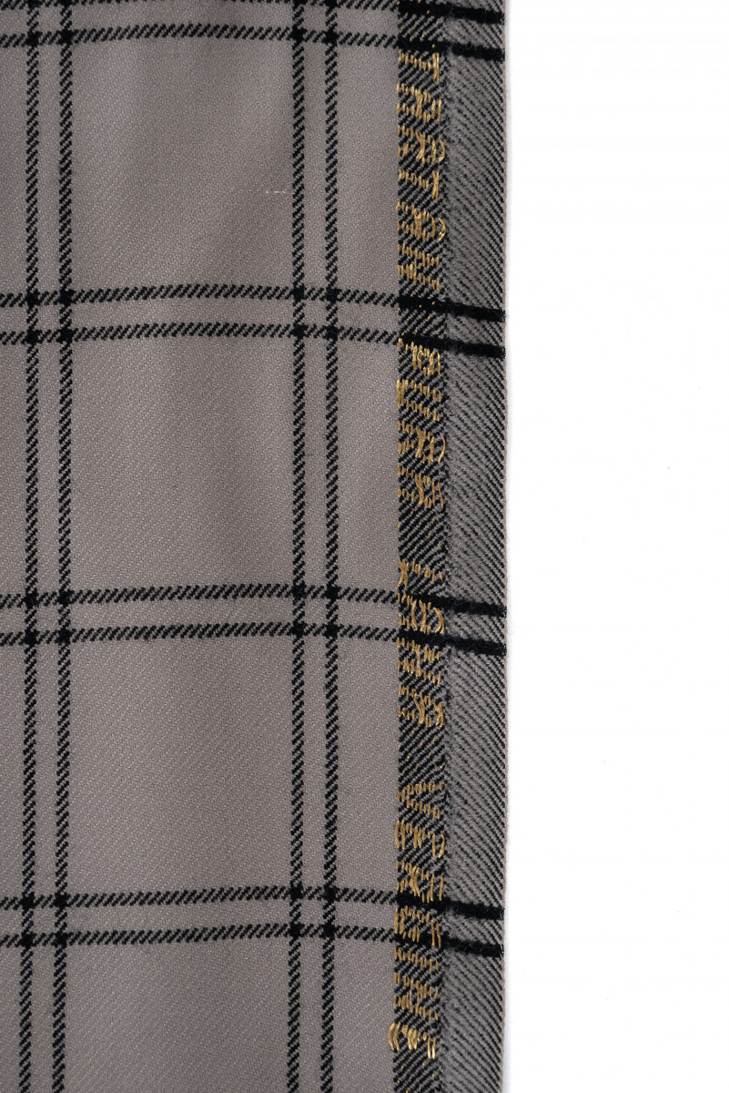 Laine fantaisie italienne avec un tissage sergé gris-beige avec un motif à carreaux noirs (8 cm). Tissu non élastique d’une épaisseur classique.