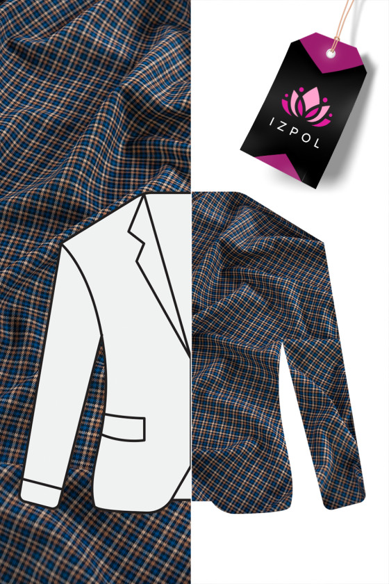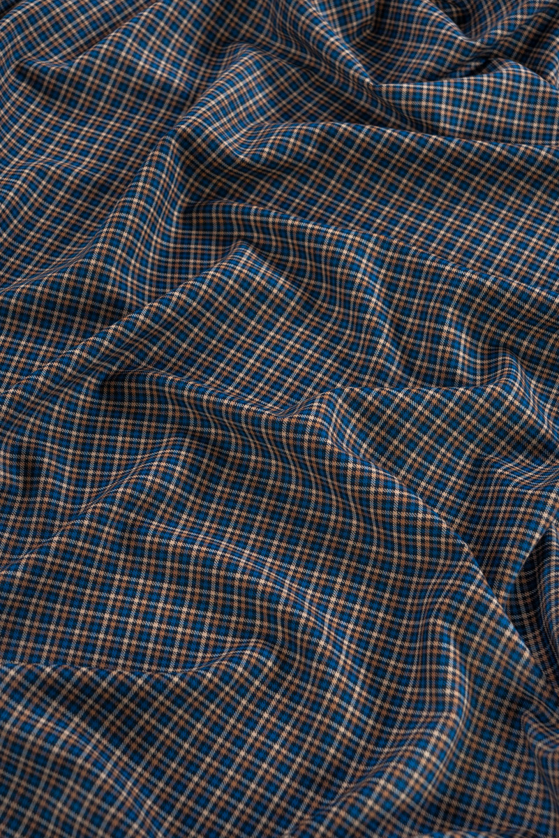 Laine fantaisie italienne à carreaux fins (0,5 cm) en noir, beige et bleu mer. Un tissu moyennement épais, élastique et doux avec un tissage dense.