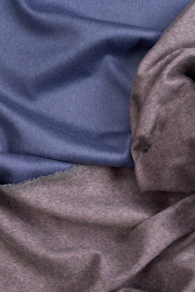 Tissu de manteau italien tissé à partir de laine naturelle avec ajout de cachemire. Le tissu est double face, un côté est en violet, l’autre en gris. Les tissus en laine sont idéaux pour les vêtements d’extérieur (manteau, veste, gilet) car ils réchauffent et permettent en même temps à la peau de respirer.