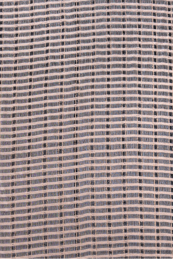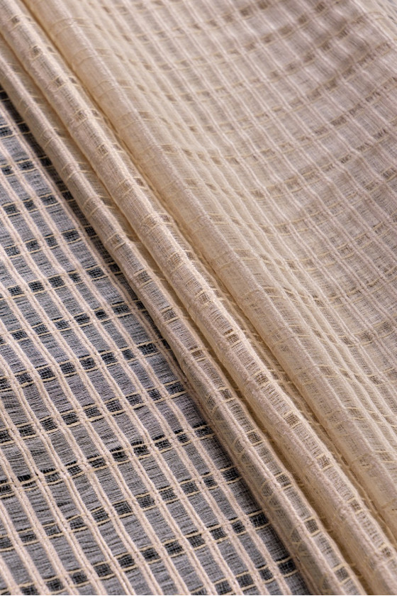Le tissu est tissé de manière très lâche à partir de fils de viscose de couleur beige clair. La structure ressemble à de la gaze, le motif forme une grille irrégulière.