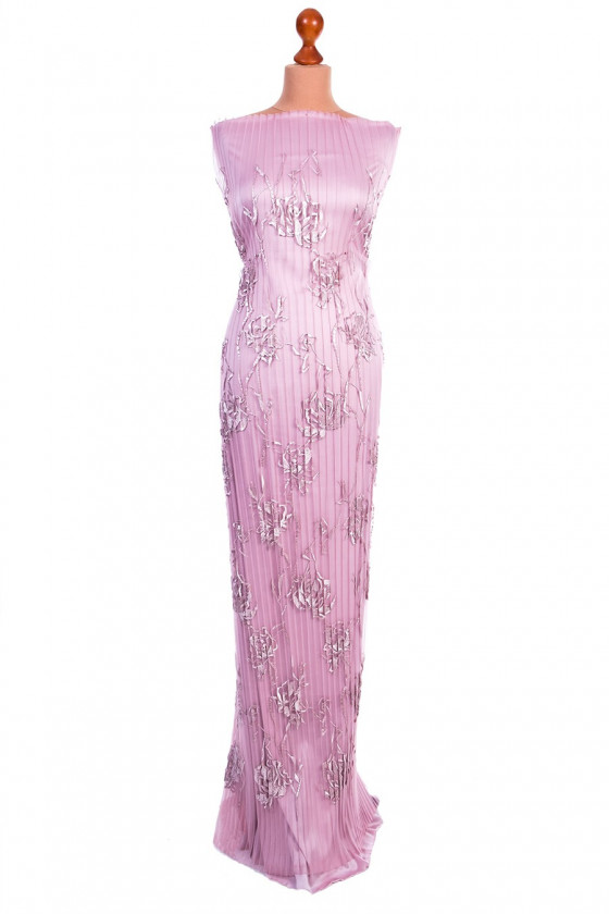Tulle plissé italien avec fleurs brodées en rose sale. La largeur du store plissé est de 1,5 cm. Le tissu est cousu sur la circonférence. Parfait pour coudre une jupe ou une robe.