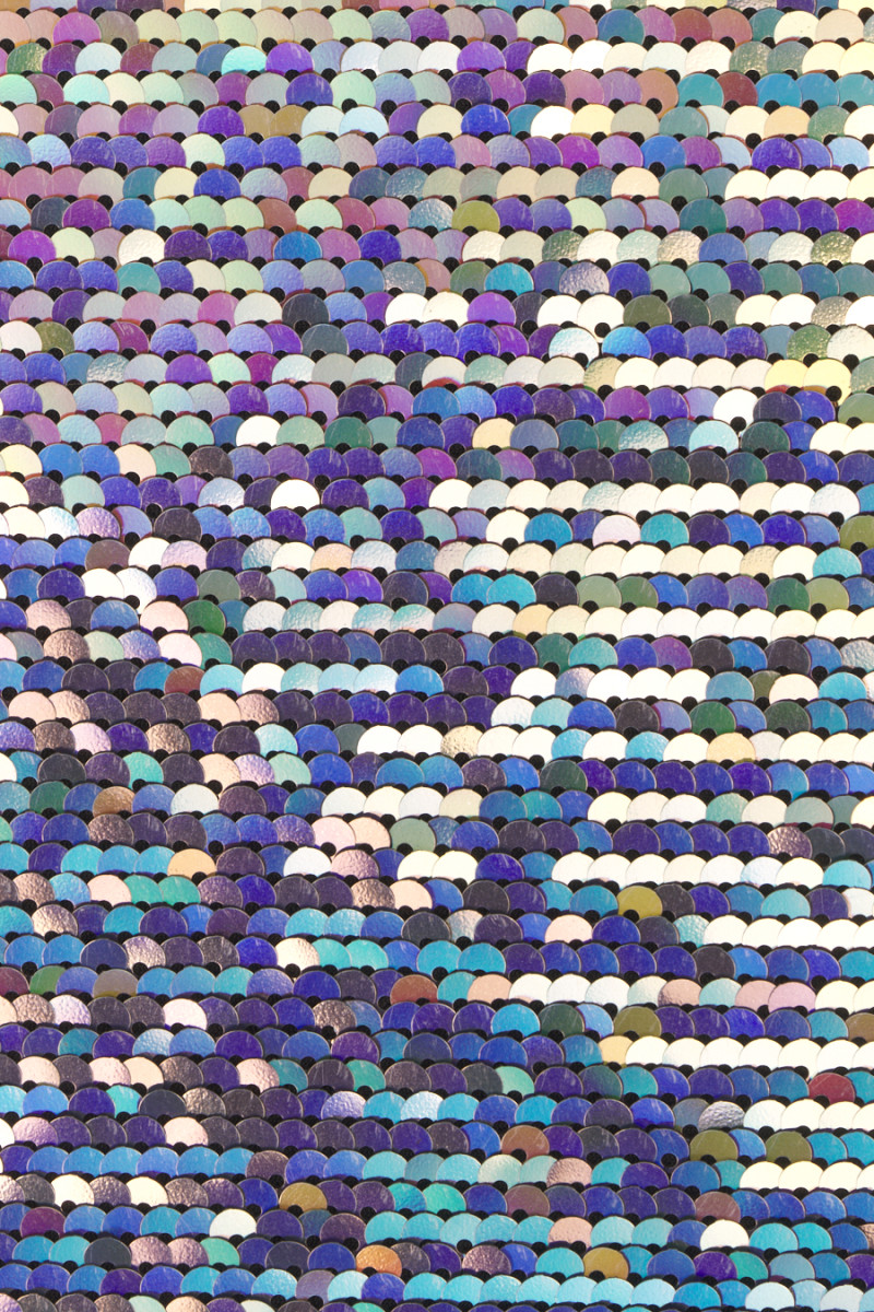 Tissu de soirée italien - paillettes retournées d’un côté en noir, et paillettes hologrammes de l’autre, cousues sur un tissu tricoté élastique.