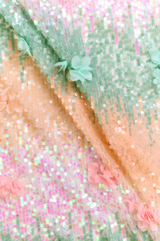 Tulle italien avec œillets classiques de couleur crème avec des paillettes menthe, rose et saumon densément cousues. Les paillettes sont mobiles et irisées, le tissu est enrichi de fleurs en mousseline régulièrement cousues, qui dépassent légèrement créant un effet 3D. Les belles couleurs des paillettes créent un effet d’ombrage, passant d’une couleur à l’autre tous les 20 cm environ. Une proposition fantastique pour coudre une robe de soirée, une jupe ou un chemisier dans une édition très originale.