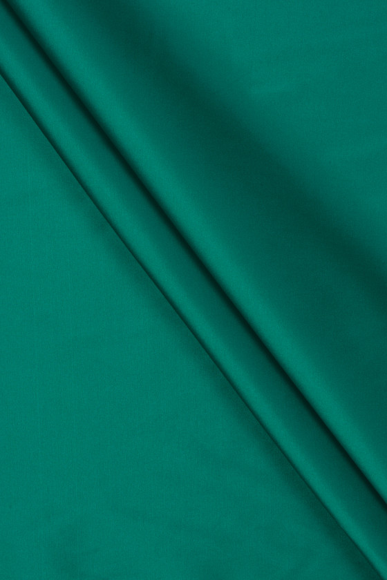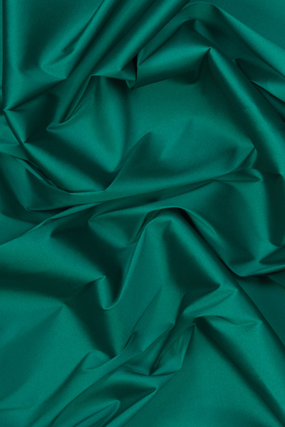 Tissu italien en taffetas de polyester tissé à partir de deux couleurs de fils : vert foncé et noir, qui créent un effet bicolore. Le taffetas est un tissu fin mais rigide avec une brillance délicate caractéristique, légèrement élastique.
