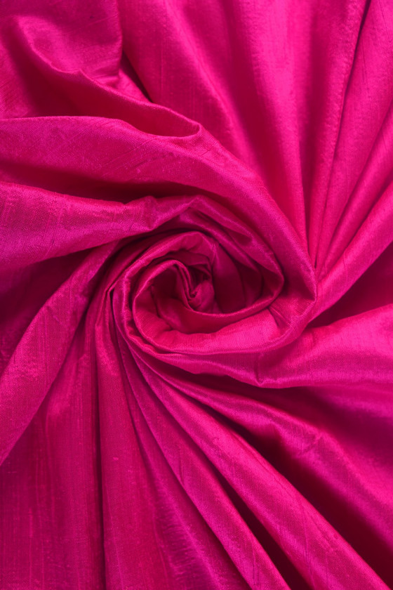 La soie Shantung avec un tissage classique et original avec des « barbes » de couleur rose-rose intense, est un tissu lâche, teint naturellement. Nettoyage à sec uniquement !