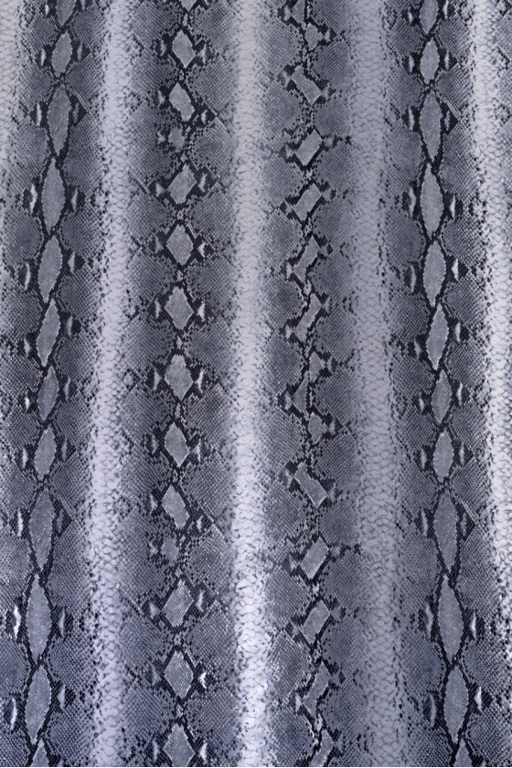 Soie plus épaisse avec un motif serpent gris, tissu lourd, fluide et mat. Nous le recommandons pour les robes, les pantalons, les jupes.