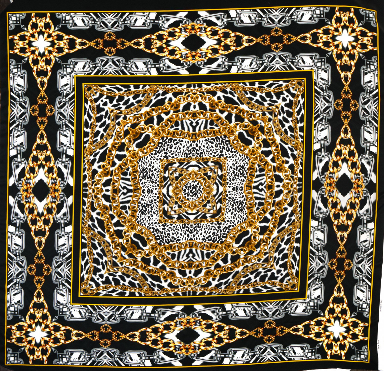 Crêpe italien 100% soie dans un coupon de dimensions de 130 cm* 140 cm. Tissu avec un motif intéressant de chaînes dorées et argentées et imprimé léopard gris-graphite. Le motif provient de la collection de la célèbre maison de couture italienne.