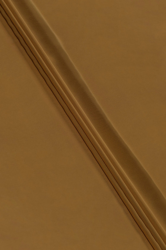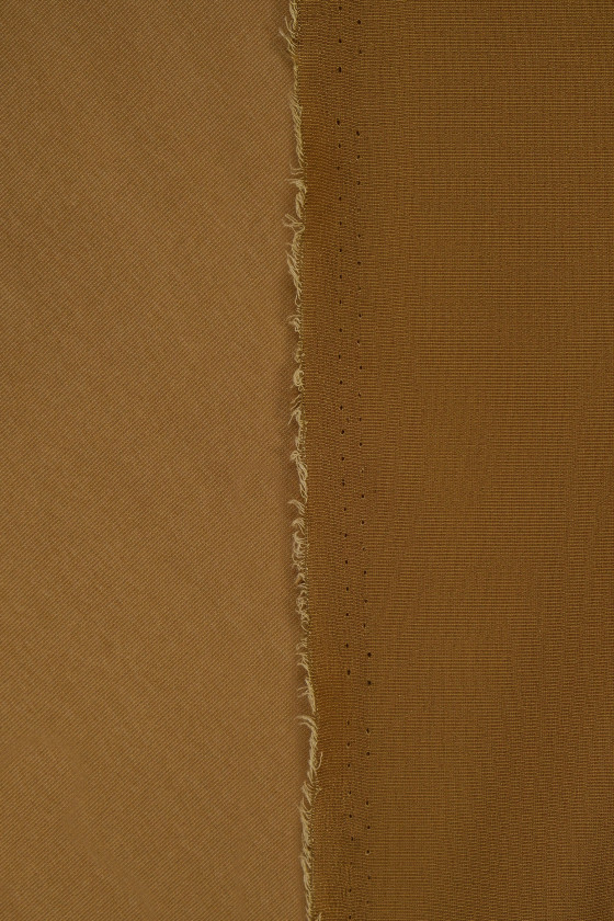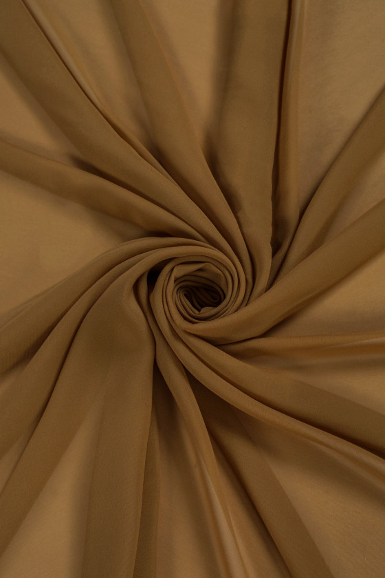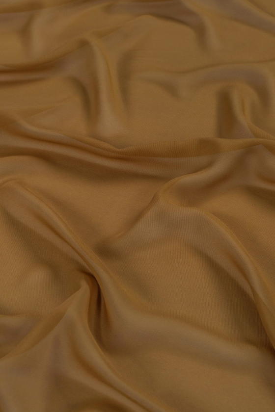 Italien, tissu fin avec un tissage georgette de couleur vieil or. La georgette est un tissu à armure toile lâche faite de fils torsadés, ce qui lui donne une surface rugueuse caractéristique. C’est une matière aérée et délicate, transparente, elle s’adapte de manière belle et fluide.