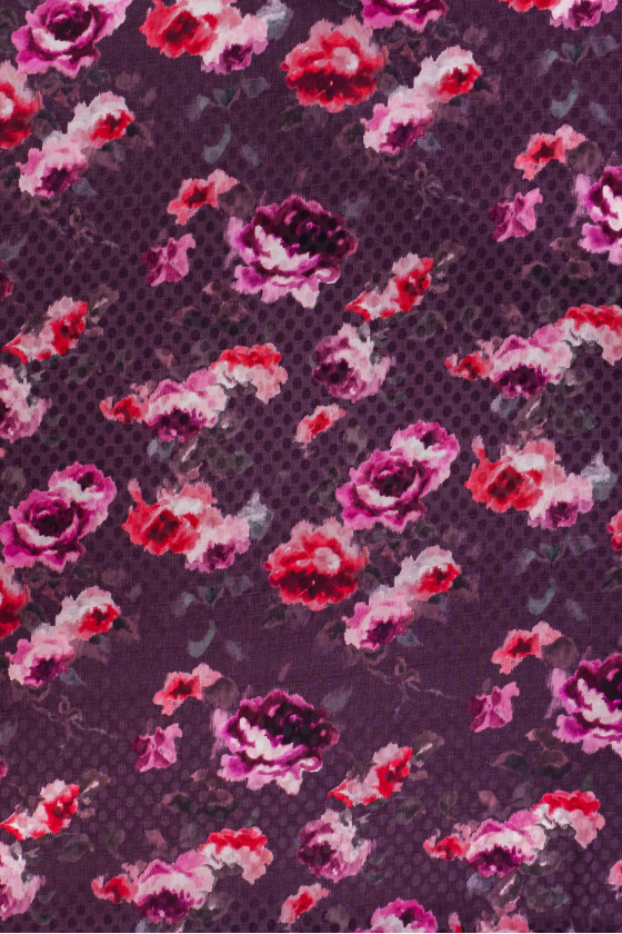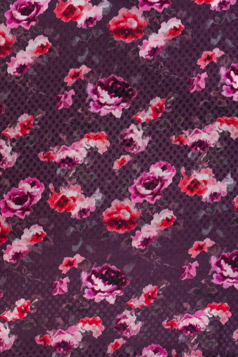 Crêpe italien 100% soie avec un tissage jacquard à pois satinés, tissu violet foncé avec un motif de fleurs peintes et colorées. Le crêpe de soie est un tissu délicat, fin et semi-mat. Il est doux au toucher et s’adapte très bien. Il peut être utilisé pour évoquer des robes aériennes, des chemisiers délicats, des jupes, des écharpes, des écharpes.