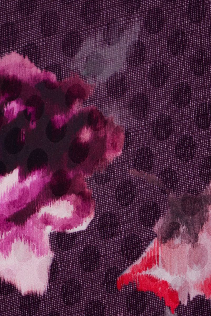 Crêpe italien 100% soie avec un tissage jacquard à pois satinés, tissu violet foncé avec un motif de fleurs peintes et colorées. Très original - UNIQUE !!