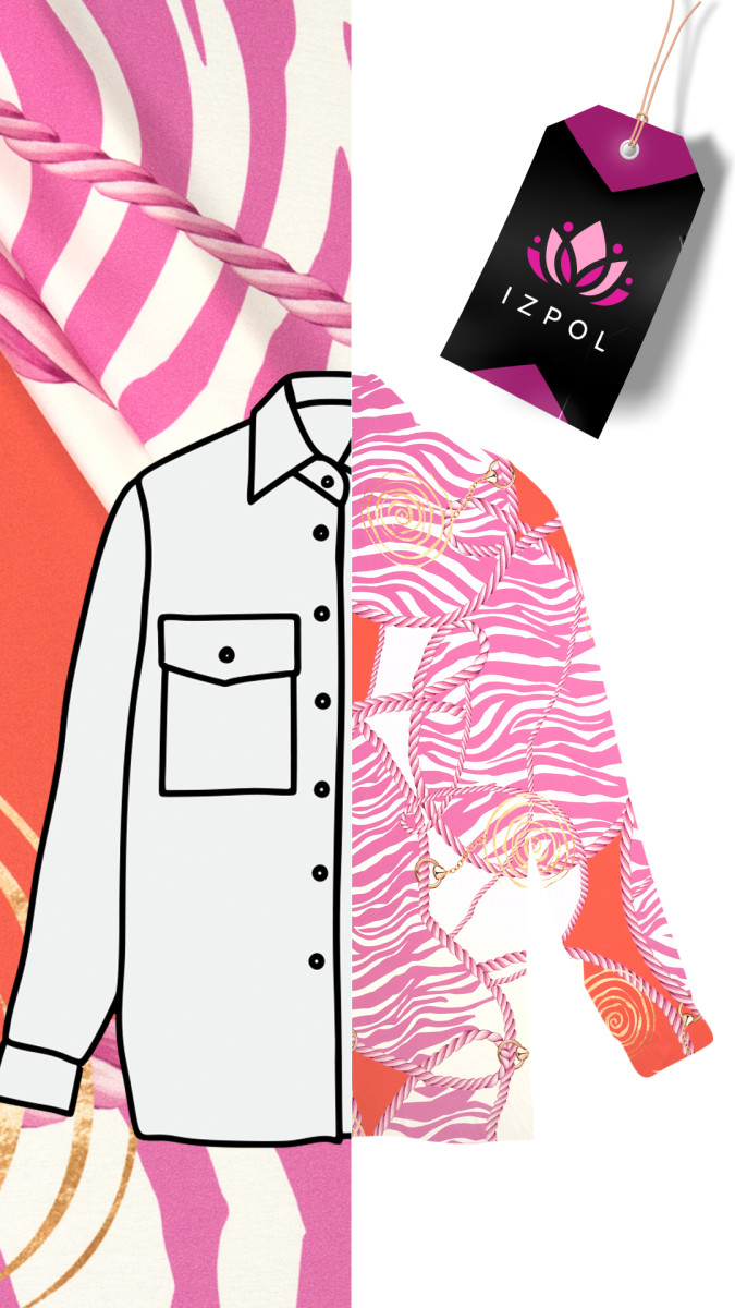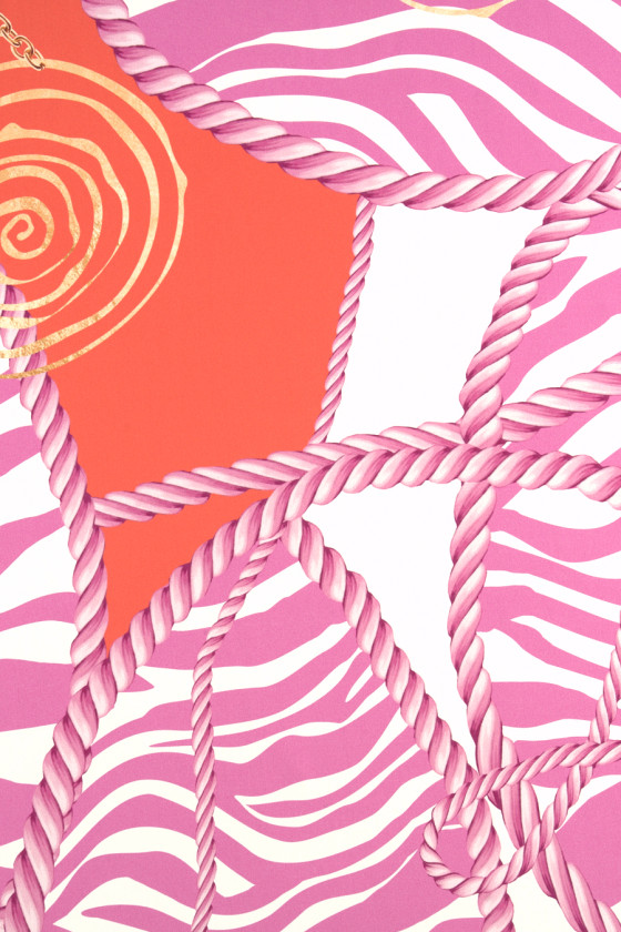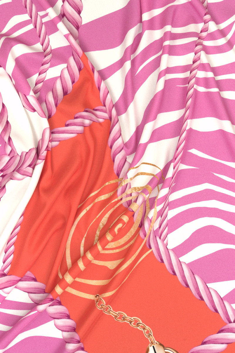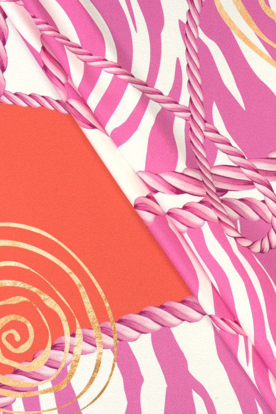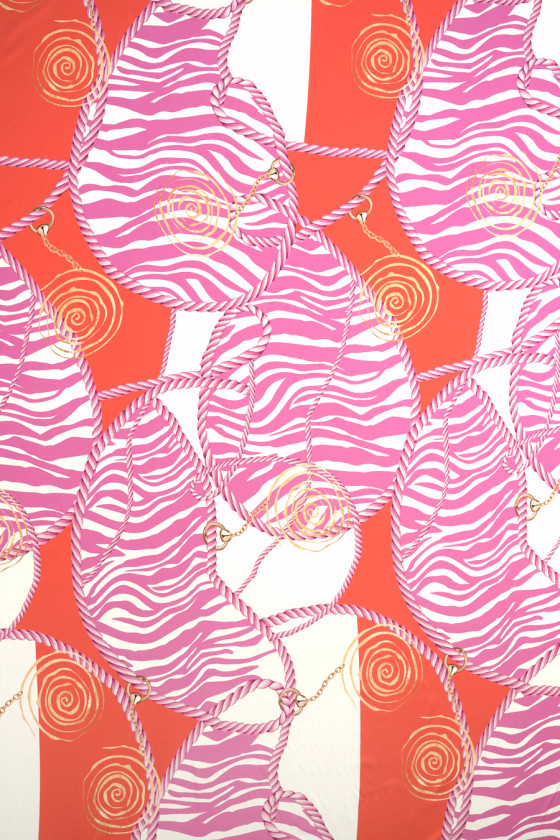 Satin de soie italien avec l’ajout d’élasthanne avec un imprimé réalisé sur un côté mat. Un motif très intéressant de grands motifs en forme de larme, rempli d’un motif zébré rose et crème. L’ensemble est complété par des ficelles roses et des chaînes dorées terminées par de gros escargots. L’arrière-plan est composé de larges rayures verticales crème et orange. Le tissu est très original dans de belles couleurs estivales. L’ajout d’élasthanne le rend plus confortable à porter et se froisse moins. Il est parfait pour coudre une chemise, une robe ou une jupe originale.