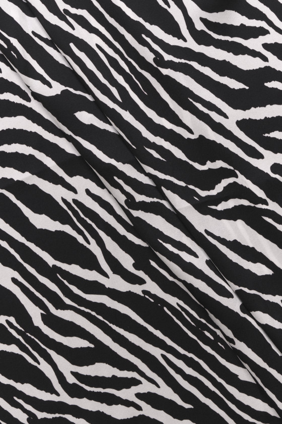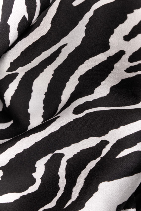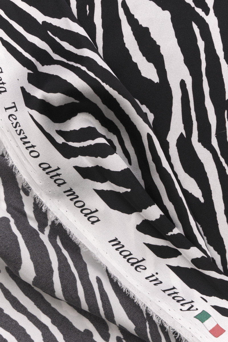 Satin de soie italien avec ajout d’élasthanne dans un motif zèbre noir et blanc de taille moyenne. Le tissu est élastique, fluide, délicat au toucher, doux et opaque. Un design classique et intemporel qui peut être utilisé pour évoquer une chemise délicate, une jupe ou une robe aérée.