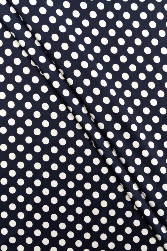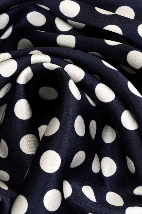 Satin de soie italien avec élasthanne bleu marine foncé à pois blancs. Des classiques dans une édition élégante !