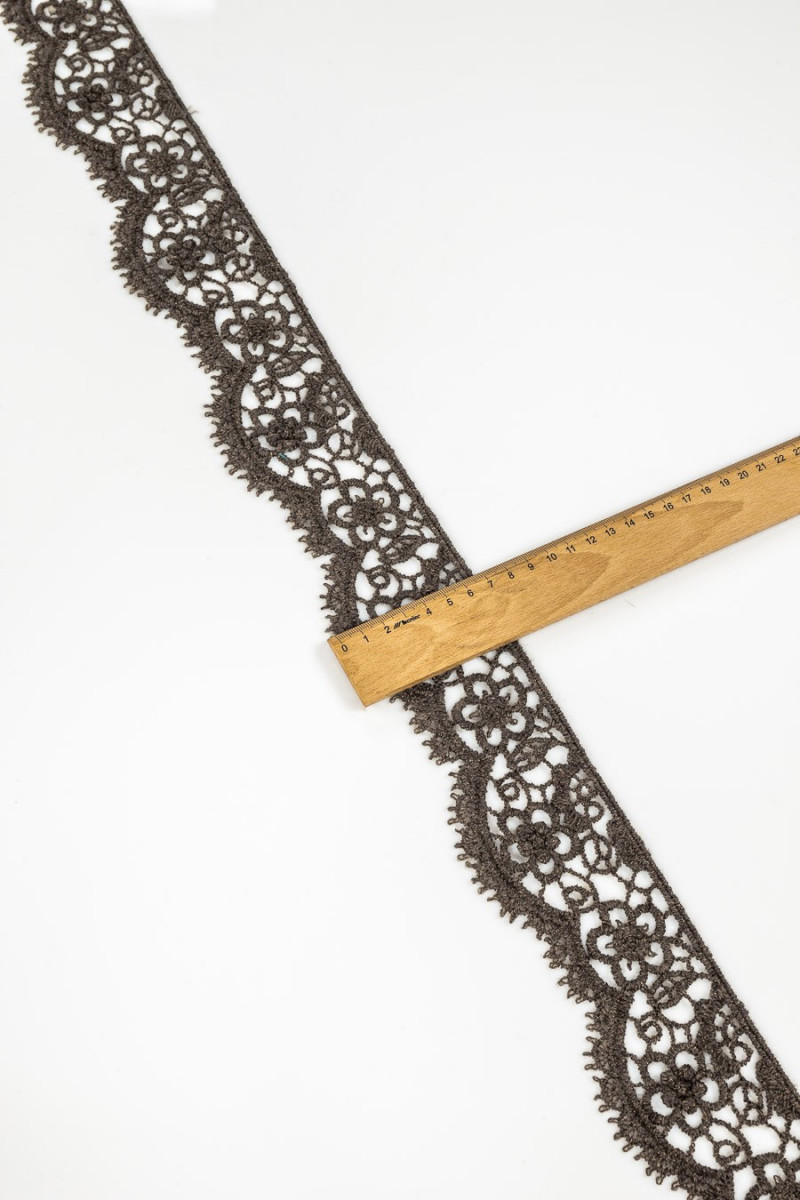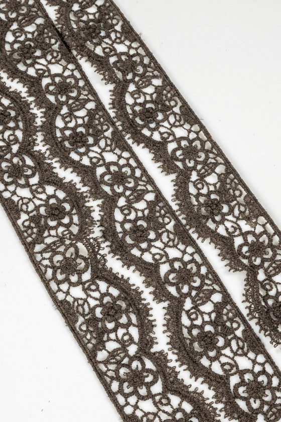 Ruban de mercerie italien de couleur terreuse avec fil de lurex. Motif floral, fini avec une dent sur un côté. Composition : laine naturelle, lurex.