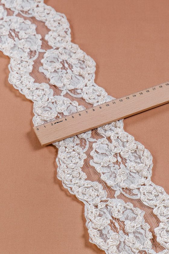 Ruban de mercerie italien - dentelle de 13 cm de large. Un motif floral orné d’une ficelle en forme de « tourbillons » de couleur crème. Le ruban est fini des deux côtés avec une dent.