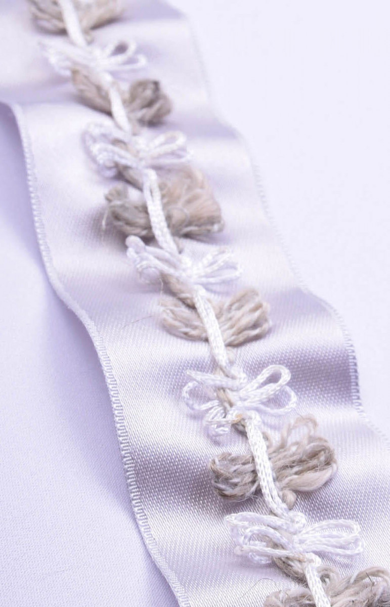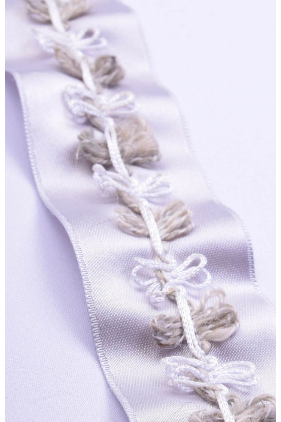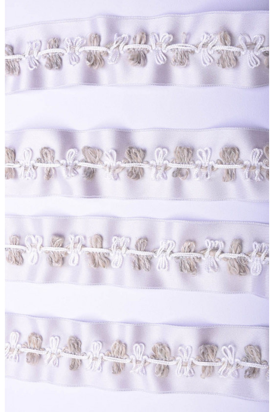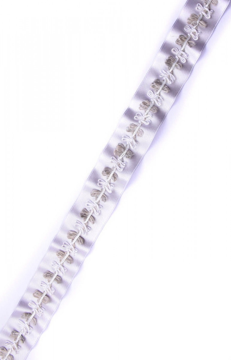 Ruban de mercerie idéal pour les finitions et les accessoires. Sur le ruban gris clair, des boucles blanches et olive.