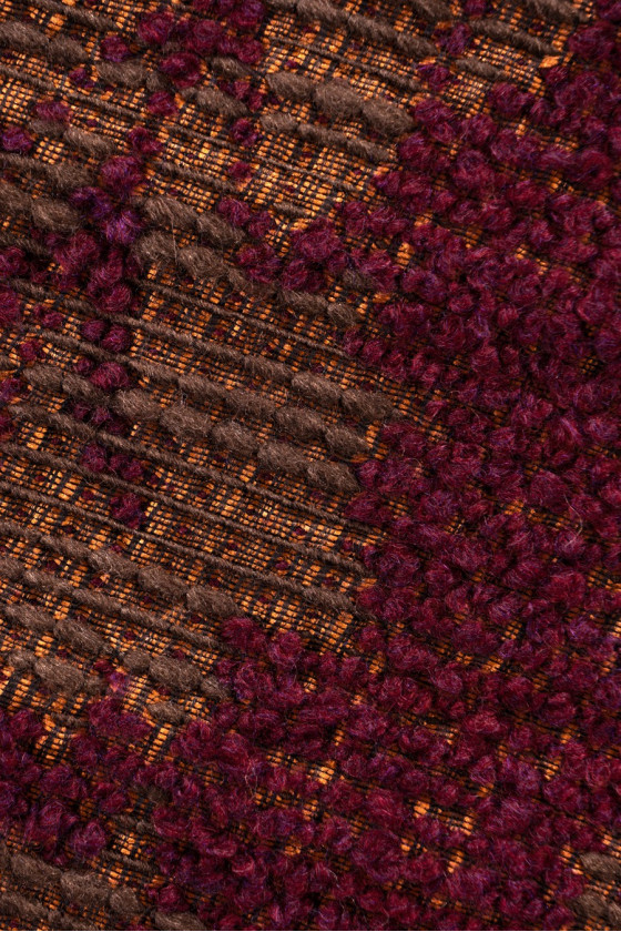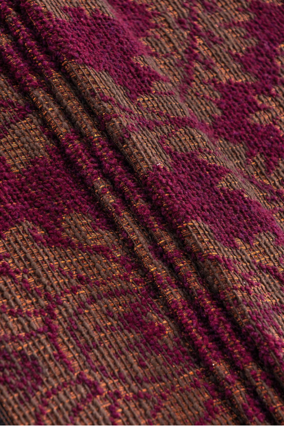 Tissu de costume italien dans de belles couleurs cuivrées-violettes avec un grand motif oriental. Un motif de laine naturelle est tissé sur le tissu en polyester. Tissu plus épais mais doux - parfait pour coudre un cardigan, des ponchos, des gilets.
