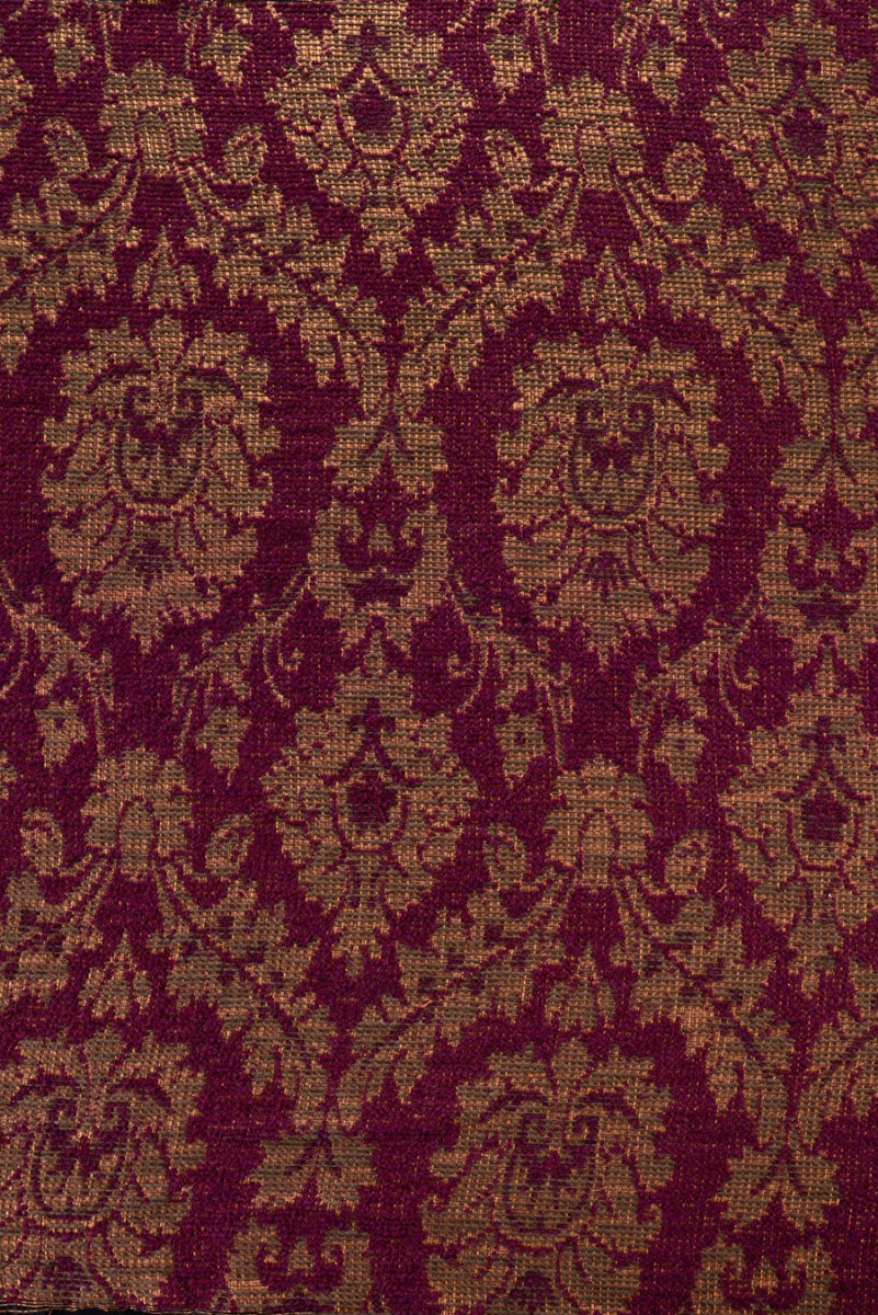 Tissu de costume italien dans de belles couleurs cuivrées-violettes avec un grand motif oriental. Un mélange de laine naturelle et de polyester.