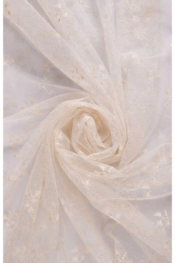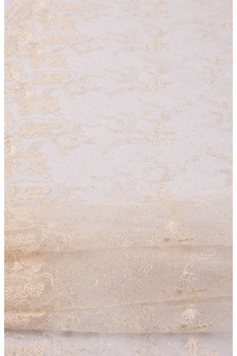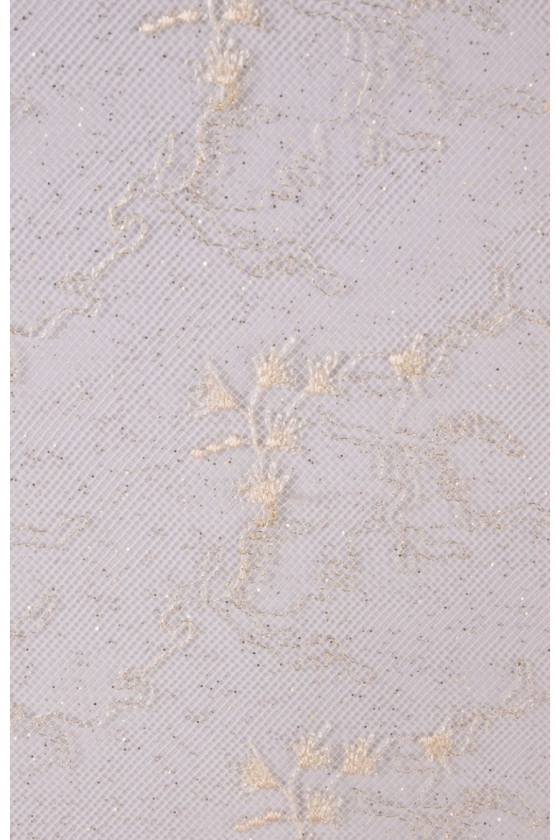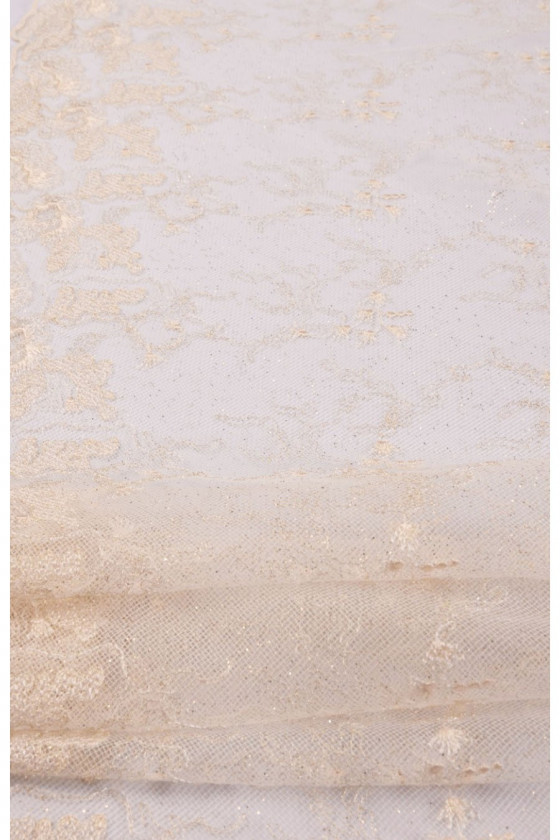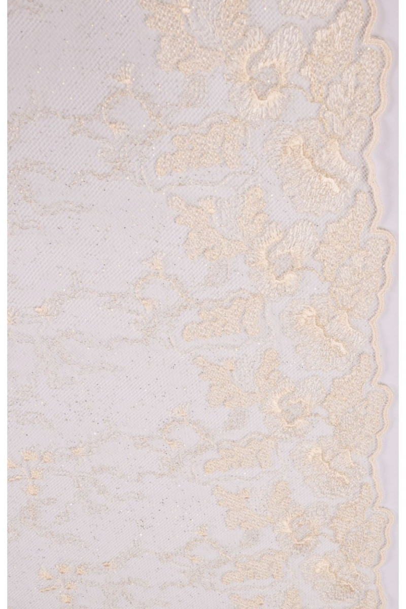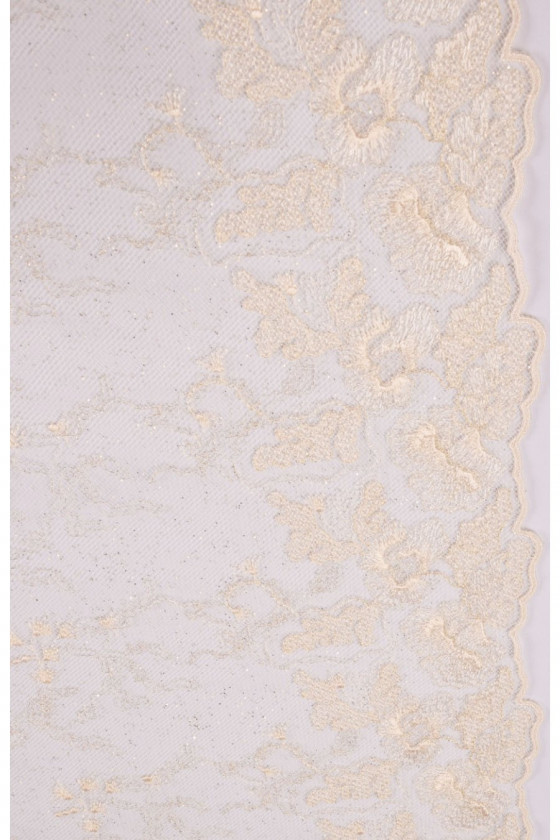 Dentelle de mariage française avec un délicat motif écru classique, finie des deux côtés avec une dent décorative. La dentelle est délicatement décorée de fil de lurex et de paillettes (elle ne tombe pas), ce qui la fait briller magnifiquement.