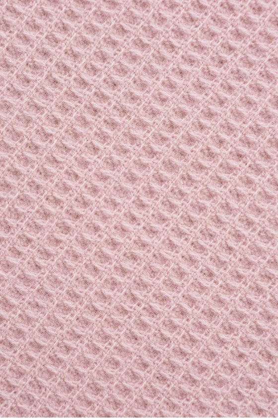 Tissu italien plus épais en rose clair avec une texture semblable à celle d’une gaufre. Tissé à partir de laine naturelle. Les tissus en laine sont idéaux pour les vêtements d’extérieur (manteau, veste, gilet) car ils réchauffent et permettent en même temps à la peau de respirer.