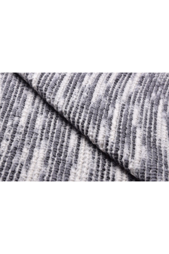 Tissu de manteau italien tissé à partir de laine naturelle avec l’ajout de cachemire de couleur gris-crème avec un motif de rayures à texture convexe.