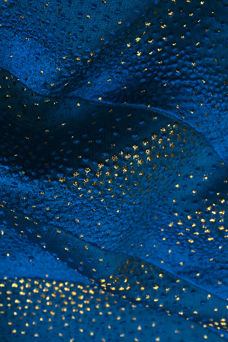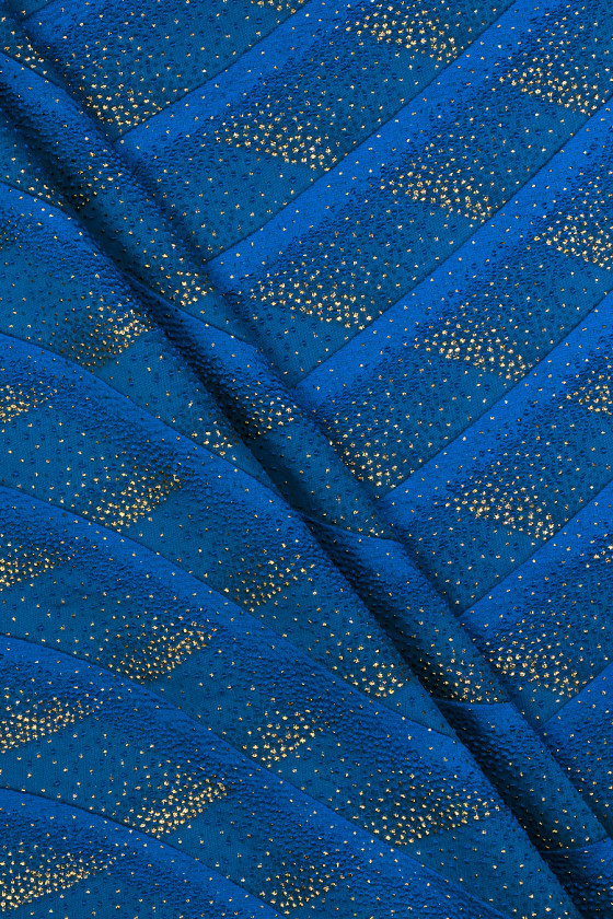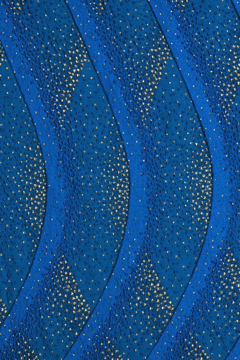 Tissu de costume en jacquard italien bleu moucheté d’or. Le tissu est tissé dans un motif de vagues bleues décorées de points bleus et dorés. Le matériau a une structure convexe, il est doux, mince mais opaque. Une belle proposition pour coudre une robe, une jupe et une veste pour les grandes occasions.