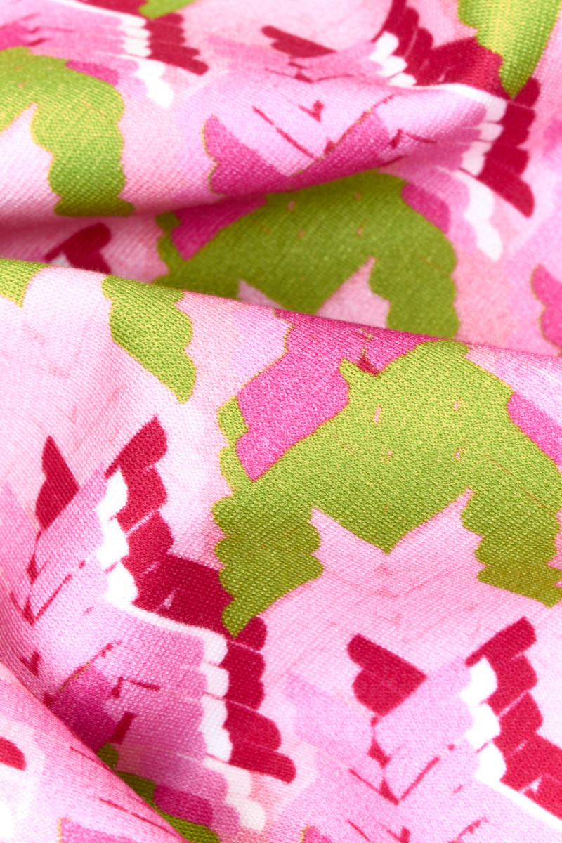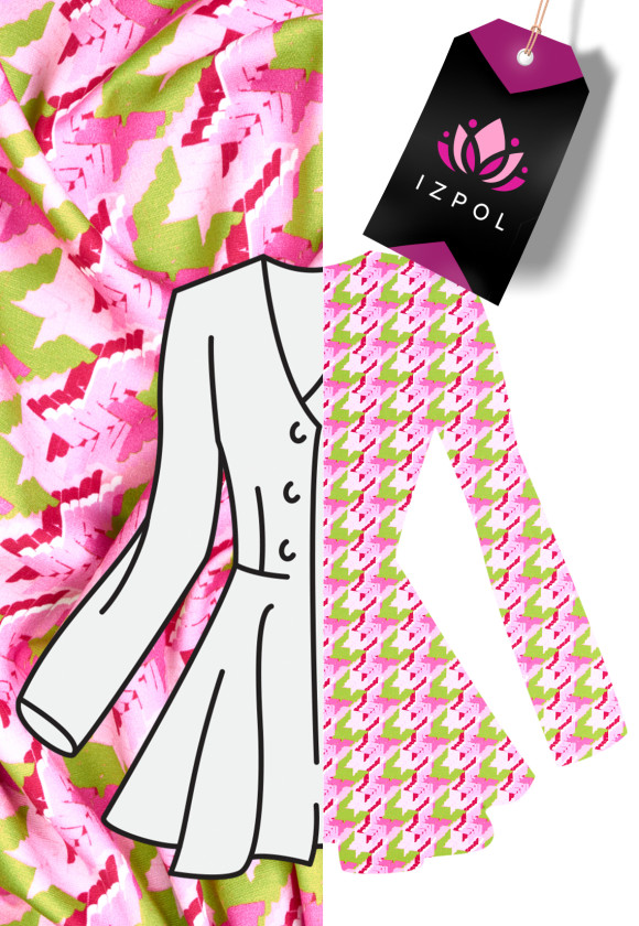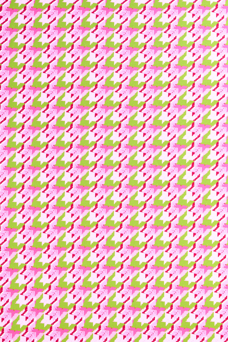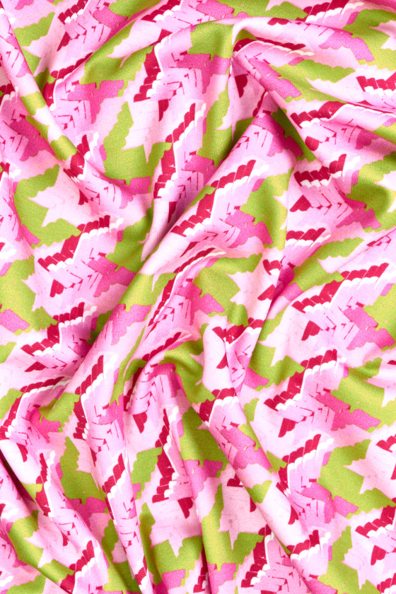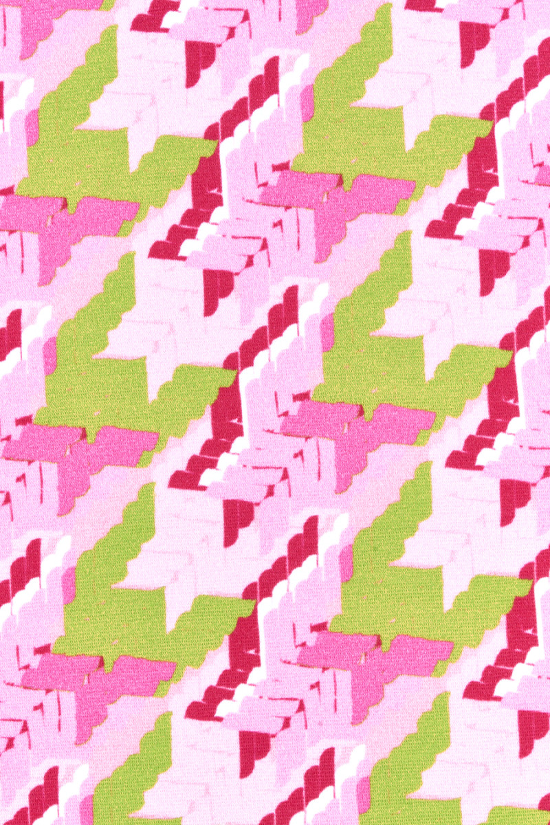 Tissu tricoté en jersey italien avec un grand motif de pattes de poulet (7 cm) en rose clair et foncé et vert citron. Le tissu tricoté en jersey est un tissu de couverture avec un tissage dense, élastique, légèrement drapé, qui peut être cousu sans doublure.
