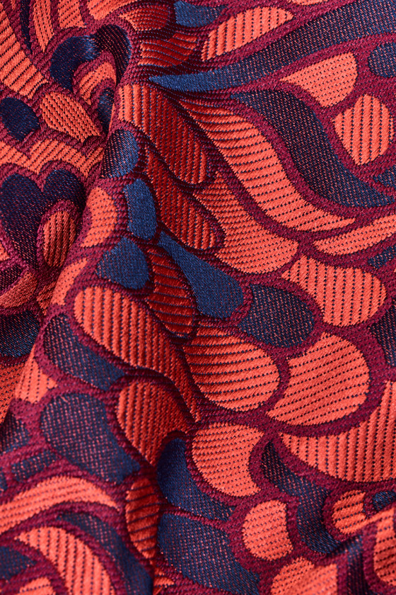 Tissu de costume en jacquard italien avec des motifs fantaisie en bleu marine foncé et orange avec des bordures bordeaux. Le tissu est charnu, inélastique, légèrement rigide. Une proposition intéressante pour coudre une veste ou un manteau unique.
