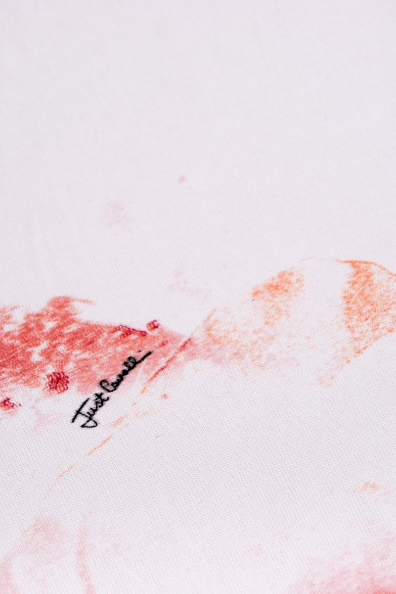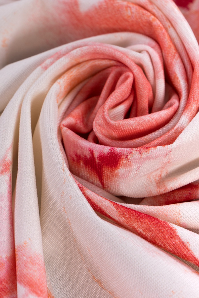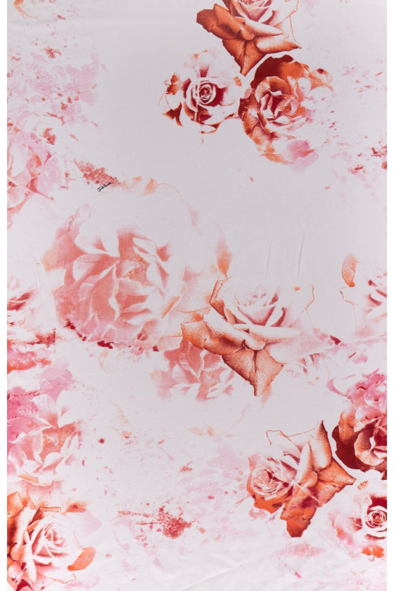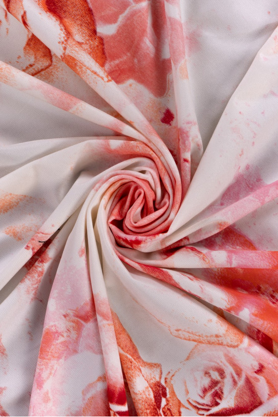 Tissu tricoté en jersey de viscose italien de couleur écrue avec un motif de fleurs roses de différentes tailles en rose et orange. Le motif est légèrement flou, ce qui le rend plus délicat et subtil, et il est signé du nom d’un créateur de mode bien connu. Le tissu a une structure légèrement rugueuse, est élastique et légèrement rafraîchissant (froid). Une proposition fanatique pour coudre une robe ou un sweat-shirt pour les fans de tissus de marque.