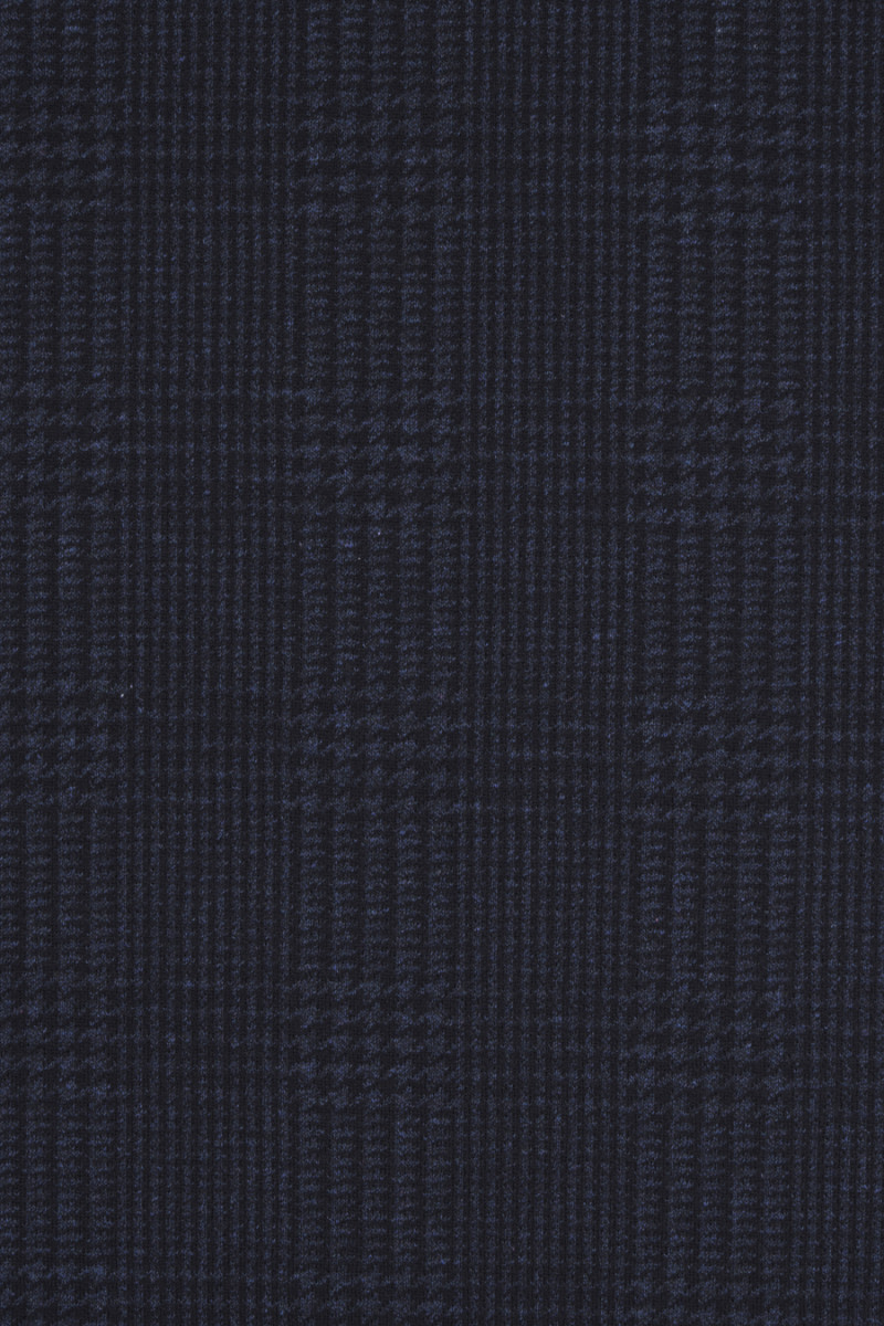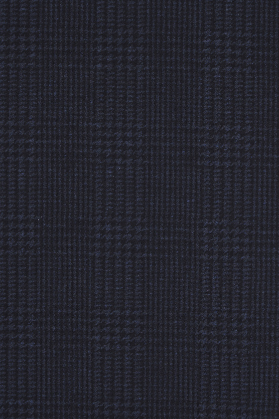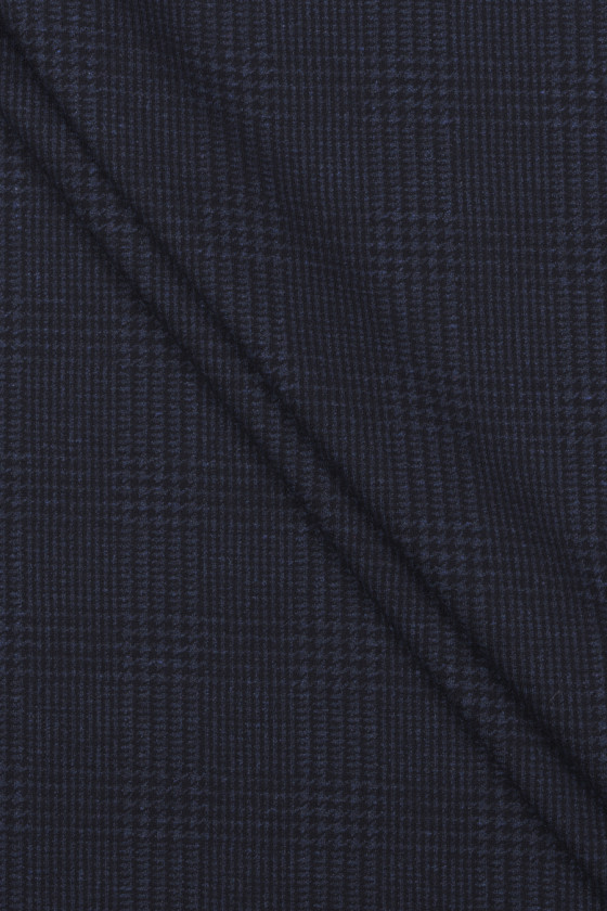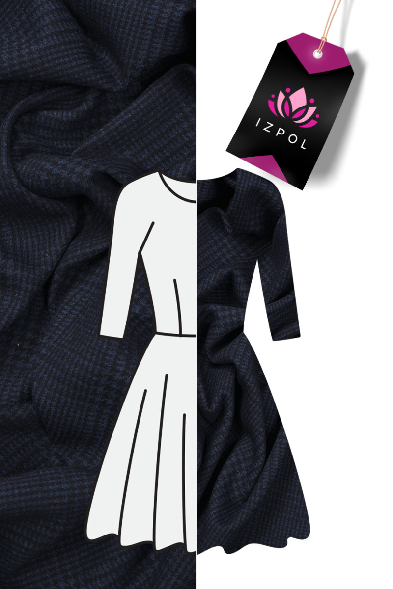 Tissu tricoté en jersey italien 100% laine avec un motif à carreaux noir et bleu marine (3,5 cm). Le tissu jersey est un tissu tricoté couvrant et légèrement drapé qui peut être cousu sans doublure.