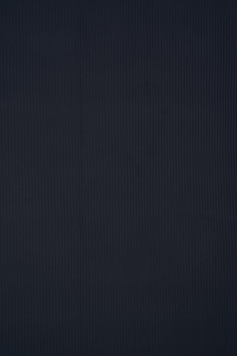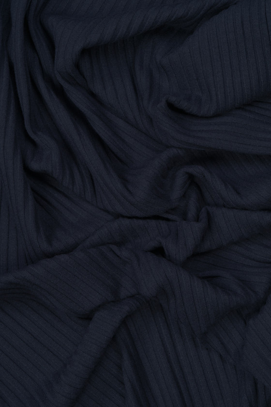 Tissu tricoté italien avec un tissage large en côtes (0,5 cm) en bleu marine foncé. Le tissu tricoté est doux, très élastique, opaque, agréable au toucher.