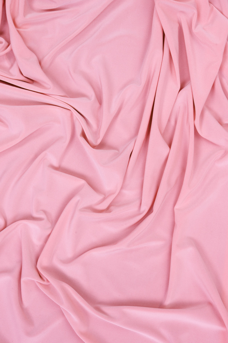 Tissu tricoté en polyester italien rose. Tissu tricoté avec un tissage compact et lisse, élastique dans les deux sens, légèrement brillant sur le côté droit.