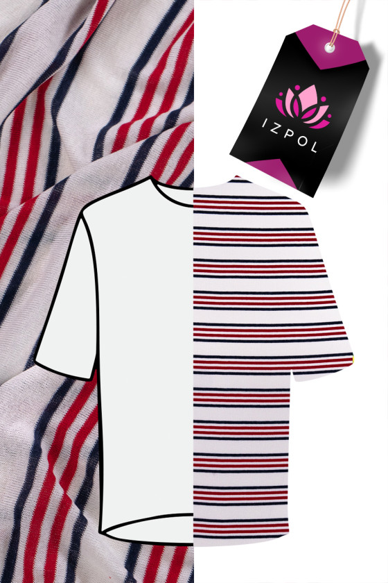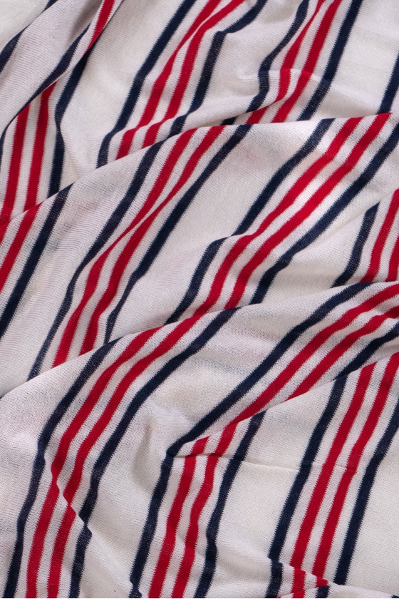 Tissu tricoté en viscose italienne à rayures rouges et bleu marine sur fond crème. Le tricot en viscose est un tissu naturel (obtenu à partir de cellulose), très doux, aéré, l’ajout d’élasthanne le rend plus durable et résistant.