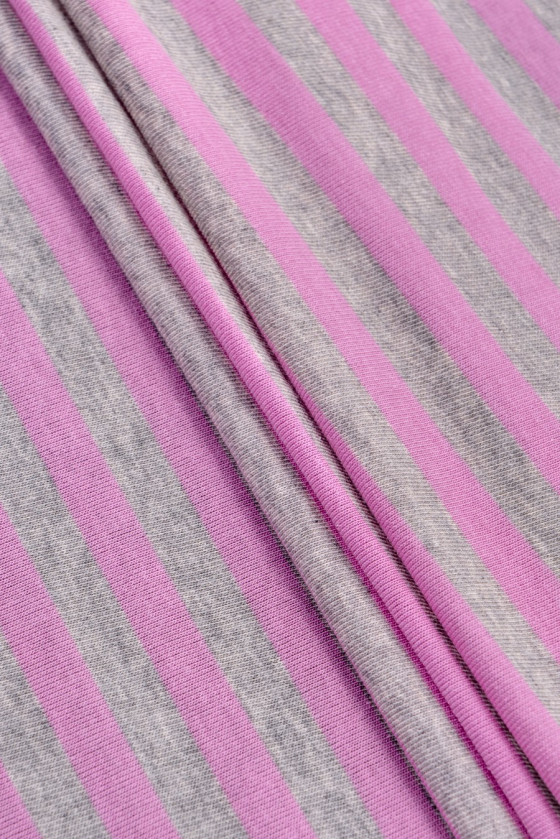 Tricot italien en viscose à rayures grises et roses - très bonne qualité. Parfait pour coudre un chemisier ou un t-shirt.