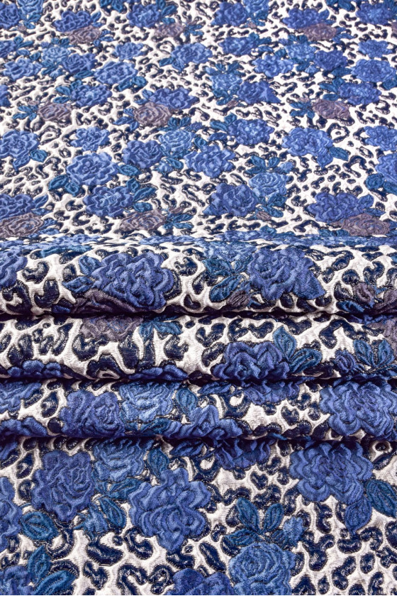 Tissu de costume en jacquard italien dans un coupon de dimensions de 65cm x 140cm. Un motif convexe très frappant de fleurs roses en bleu et bleu marine. L’ensemble est réalisé sur un fond gris clair et est décoré d’un fil brillant, ce qui donne de l’élégance au tissu. Le coupon vous permet de coudre une jupe étroite ou, par exemple, un oreiller. Il est également idéal comme base pour être combiné avec d’autres tissus.