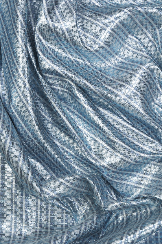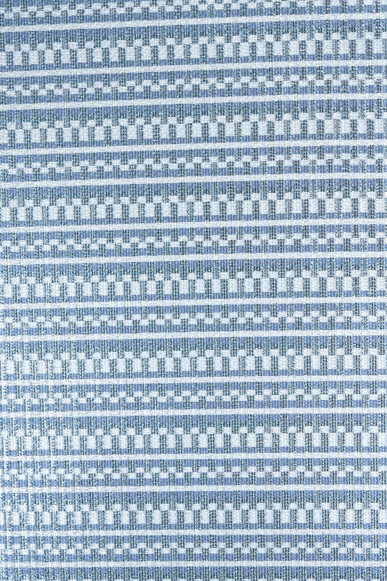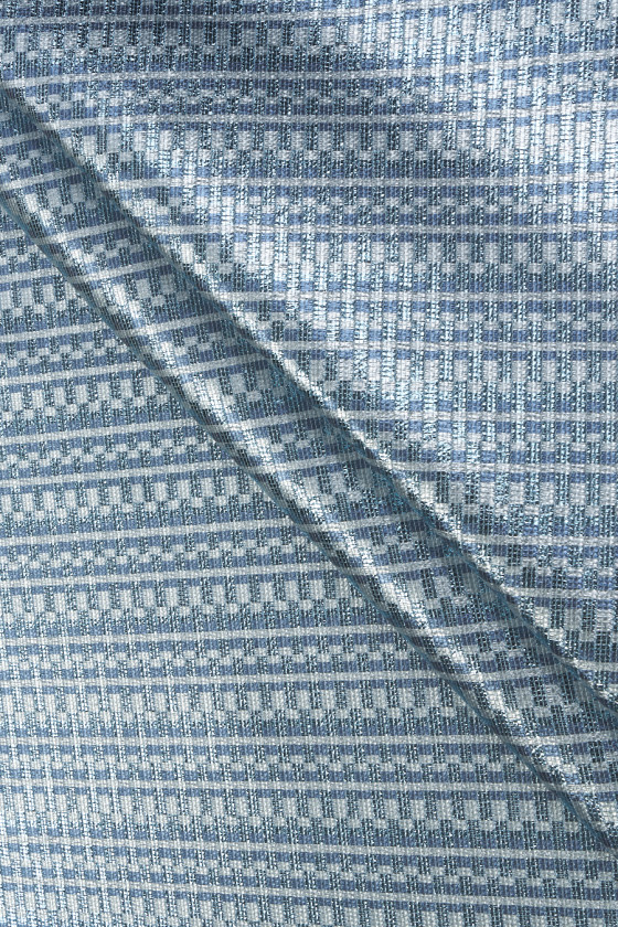 Tissu de costume jacquard italien bleu avec fil de lurex argenté. Le tissu présente un fin motif géométrique qui crée des rayures horizontales de 2 cm de large.