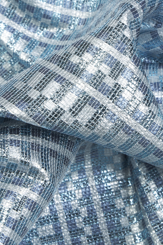 Tissu de costume jacquard italien bleu avec fil de lurex argenté. Le tissu présente un fin motif géométrique qui crée des rayures horizontales de 2 cm de large. Tissu d’épaisseur moyenne, opaque, non élastique, légèrement rigide - parfait pour coudre une robe, une jupe, un costume ou à des fins décoratives.
