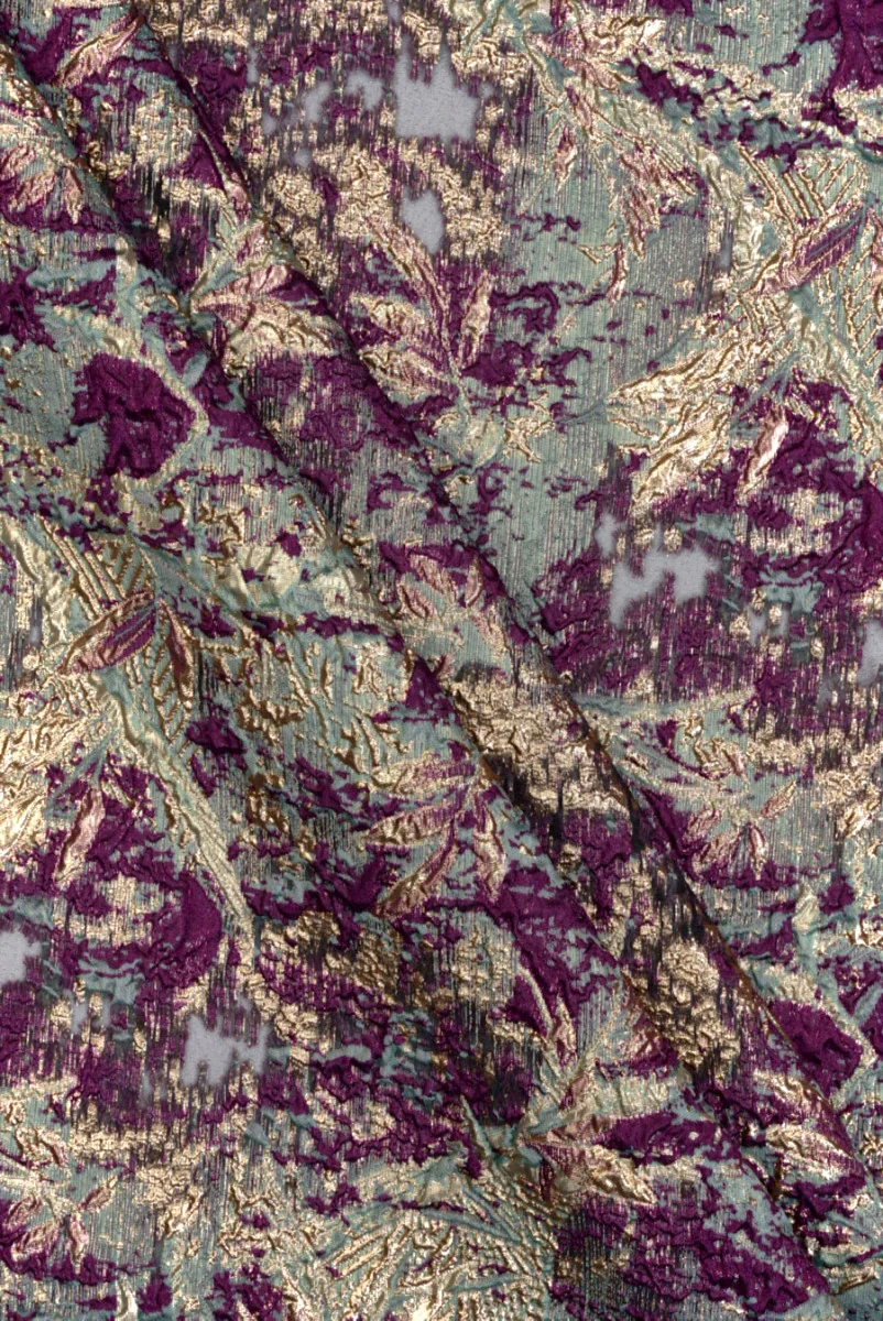 Tissu jacquard représentant des motifs abstraits et convexes en violet et or sur un fond sauge. L’ensemble est densément tissé sur un tissu d’organza noir, avec un fragment d’organza lui-même tous les 30 cm, qui est transparent et irrégulier, et sa taille est d’environ 14 cm à son point le plus large et d’environ 24 cm à son point le plus long. Le tissu est fin, inélastique, généralement opaque, légèrement rigide et le fil doré ajoute une belle brillance. Une matière éblouissante qui ira à merveille sur des tenues de soirée comme des robes, des jupes, des vestes. Il peut également être utilisé comme tissu décoratif.