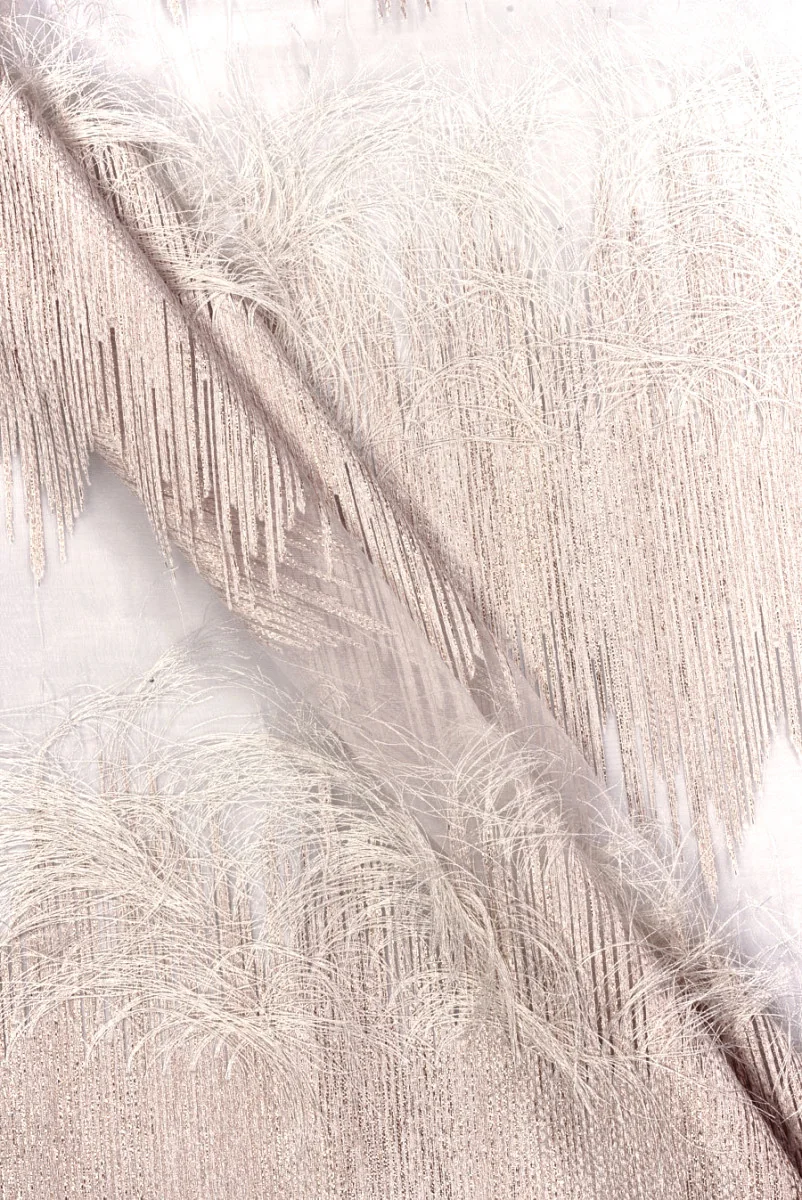 Tissu polyester organza de couleur crème avec un motif jacquard représentant des lignes densément agencées de différentes longueurs dans une couleur crème. Des motifs réguliers d’une largeur de 30 cm sont répétés à des intervalles de 8 cm au point le plus large et sont richement décorés d’un fil brillant en or rose, ce qui donne au tissu une couleur intéressante et légèrement rose. Chaque motif est complété par des pompons d’environ 9 cm de long. En raison de la disposition des franges, nous recommandons une suture circonférentielle. Le tissu est fin, transparent par endroits sans motif tissé, inélastique, s’adapte légèrement raide, mais grâce à la frange, il acquiert une belle légèreté. Nous recommandons ce matériau unique en particulier pour les robes et les jupes.