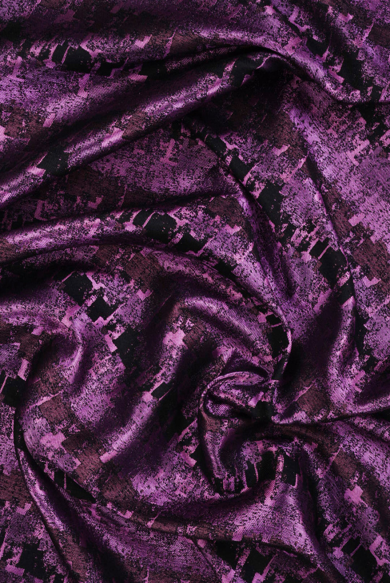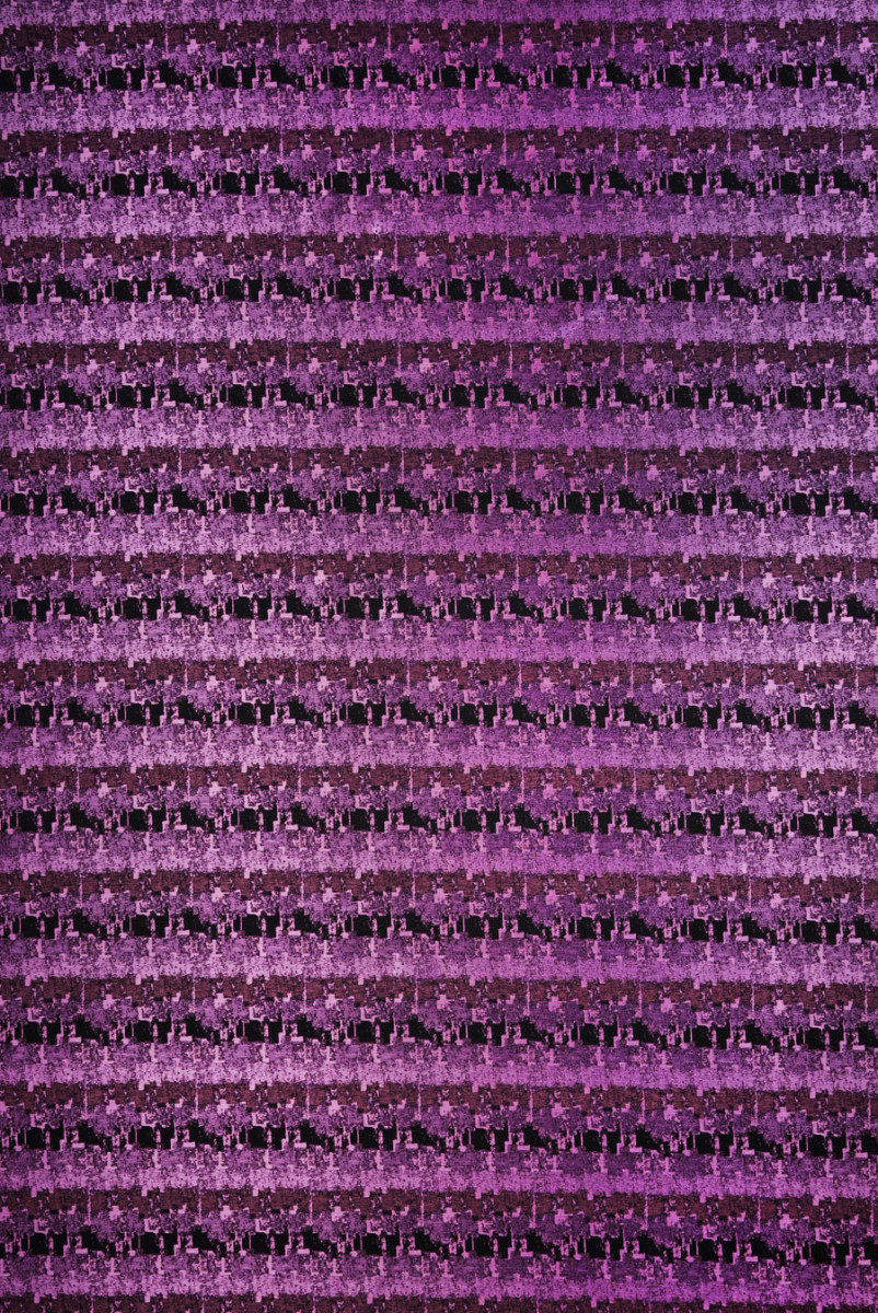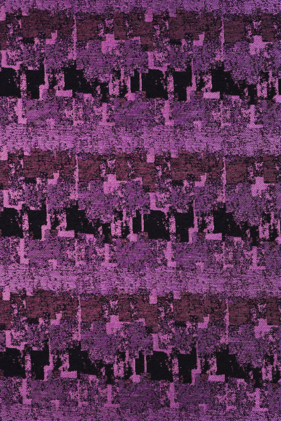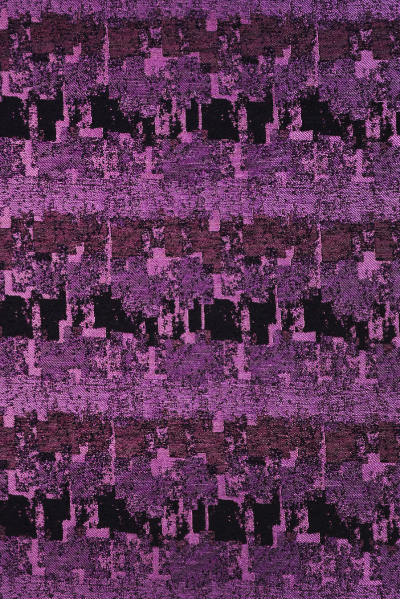 Tissu jacquard à motifs géométriques aux couleurs violettes et noires. Les motifs de taille moyenne sont densément et régulièrement localisés et disposés en lignes. La plus grande pièce mesure 2 cm * 2 cm. L’ensemble brille magnifiquement, ce qui donne au tissu un aspect unique. Il est fin mais opaque, lisse et doux dans la prise en main, inflexible et léger. Il sera parfait pour coudre un costume, une robe, une jupe, une veste et même un pantalon.