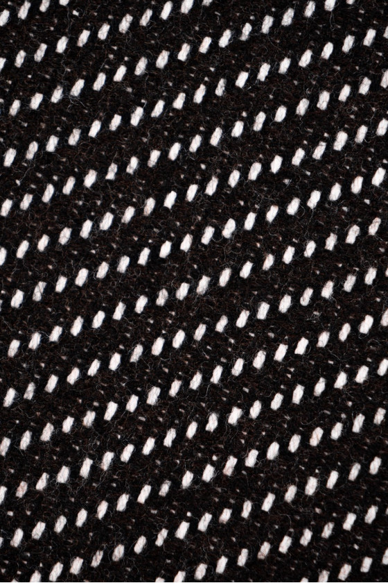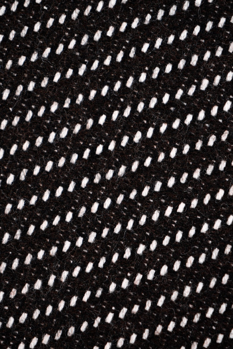 Tissu de costume italien avec une bande en sergé marron avec un fil écru entrelacé. Tissé à partir de laine naturelle avec un mélange de cachemire.